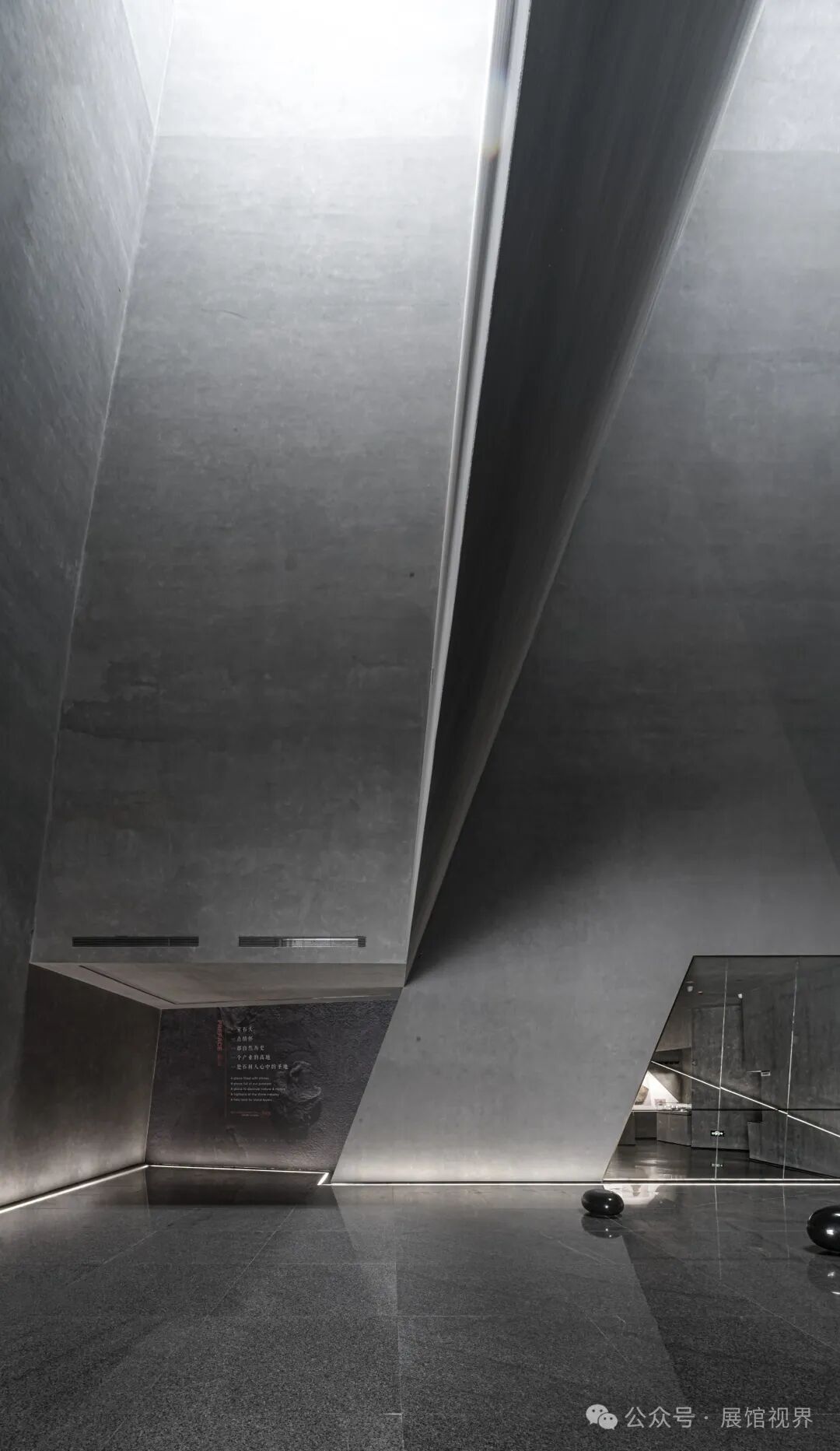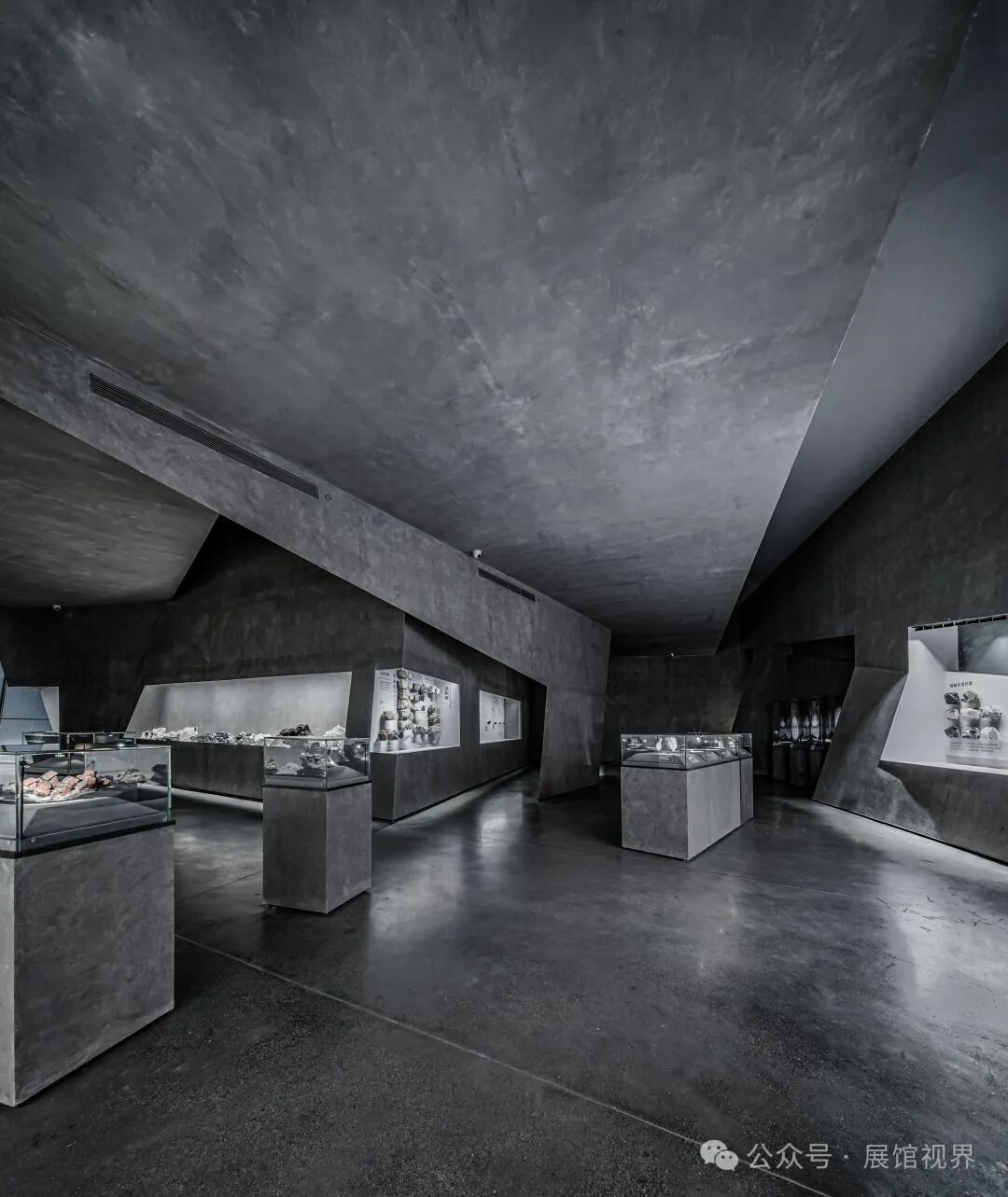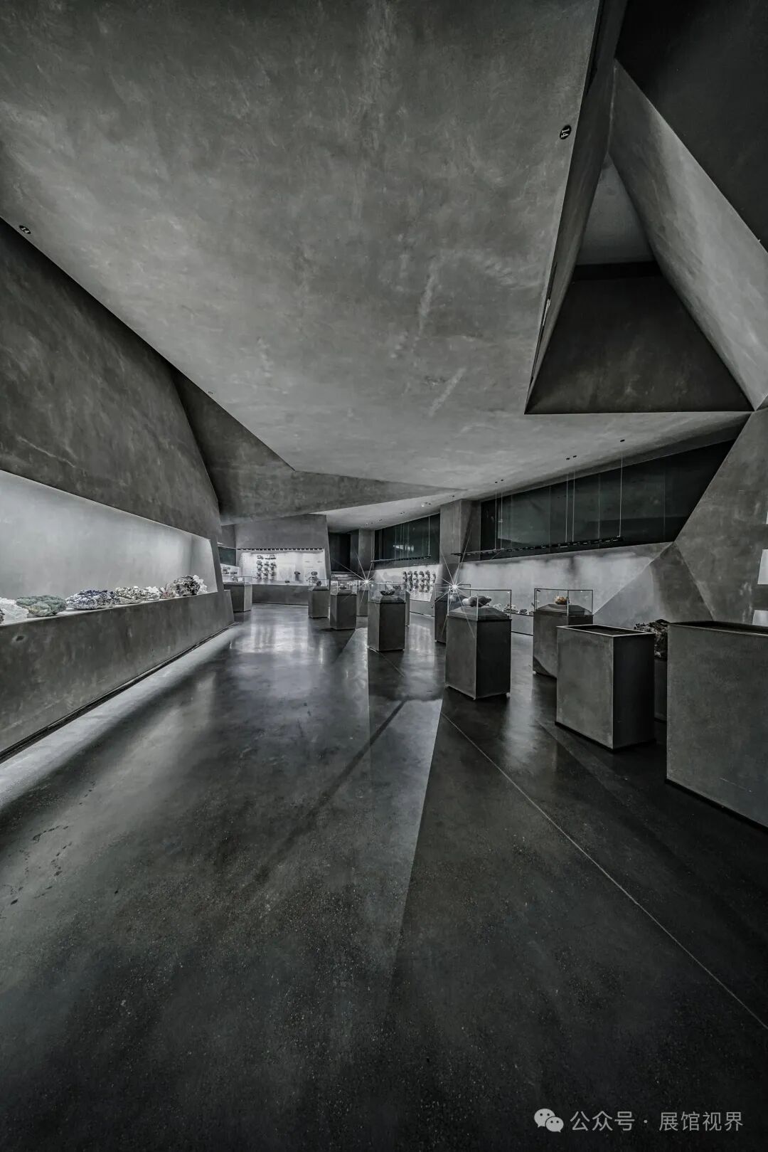 博物馆整个空间没有多余的装饰,用最原始的表达方式记录沉积亿万年的古生物印记,只使用了一个简单的构成元素——墙壁,这种简单性带来的是空间、尺度和光线体验的前置。墙壁不再仅仅是功能的分割界面,它的使用被重新创造:不仅带来平静冷峻的洞穴般的气氛衬托年代久远的地质化石展品;晶体的墙壁内部是博物馆的天花,墙壁外部承载了办公楼层的反光板功能,同时间隔了公共和私密两个分区。