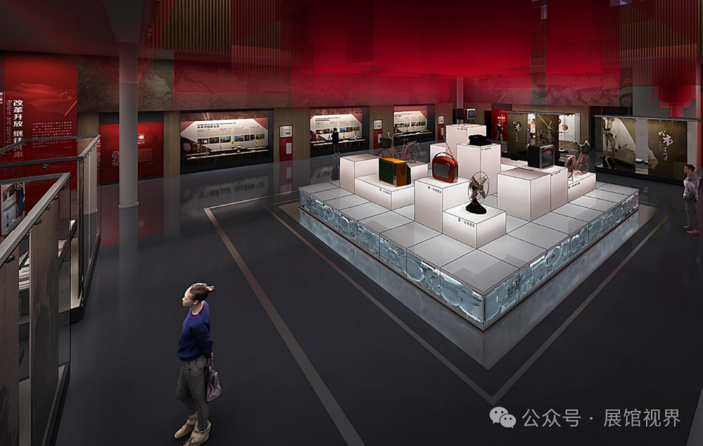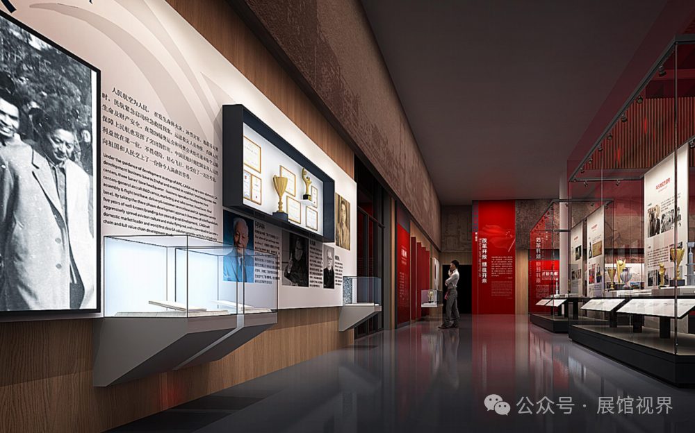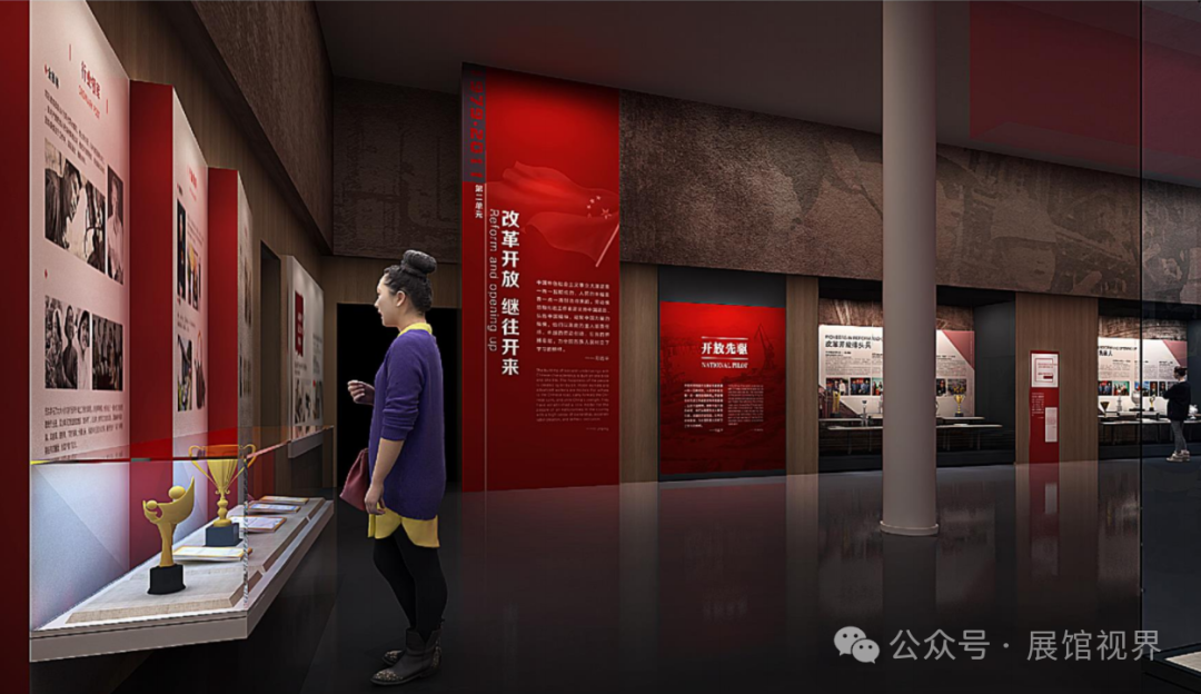 第二展厅部分与第一展厅共用空间,借助装饰材料的变化以及整体图文版式的调性转变来实现过渡。在色调方面,依旧以红色、深木色和白色为主。随着时间进程的演进,整体空间风格更趋向于现代感且更加明亮,同时增加了地面发光条带装饰,以此衔接第三展厅 “奋进新时代” 的展陈内容与展示风格。