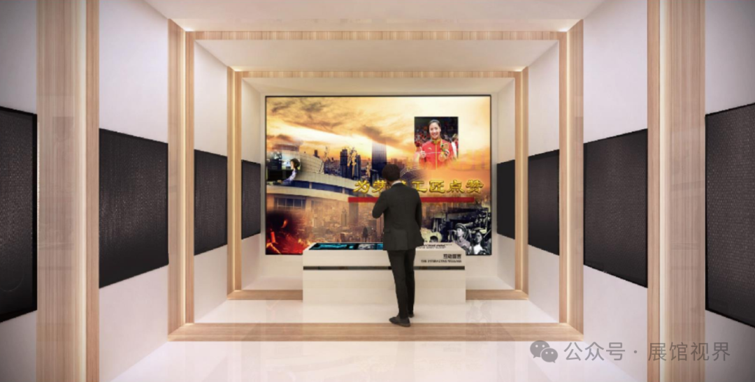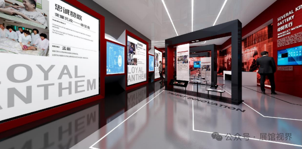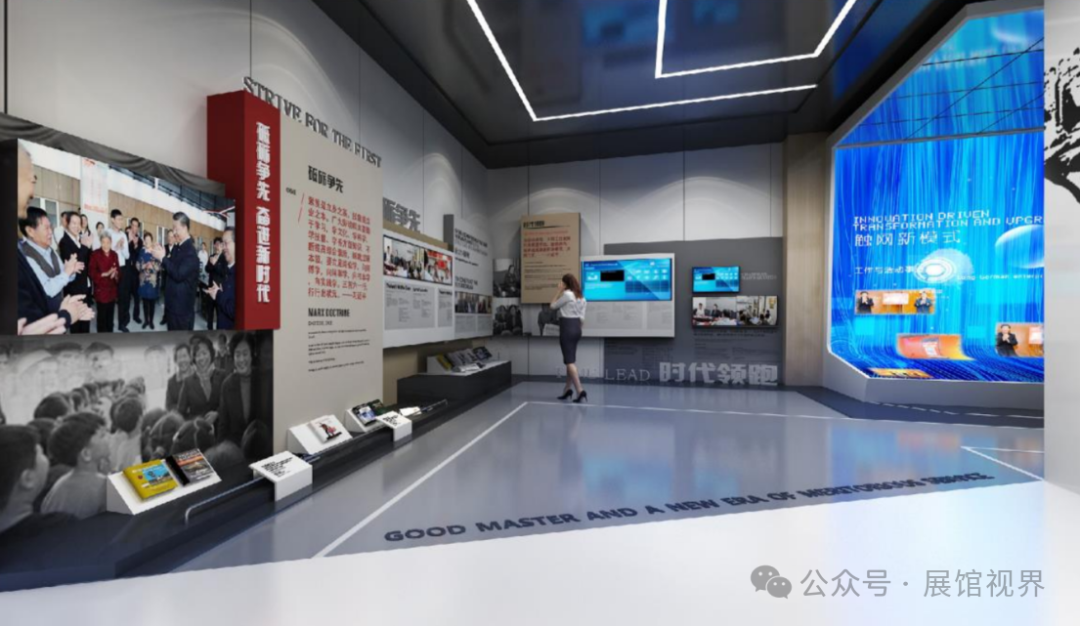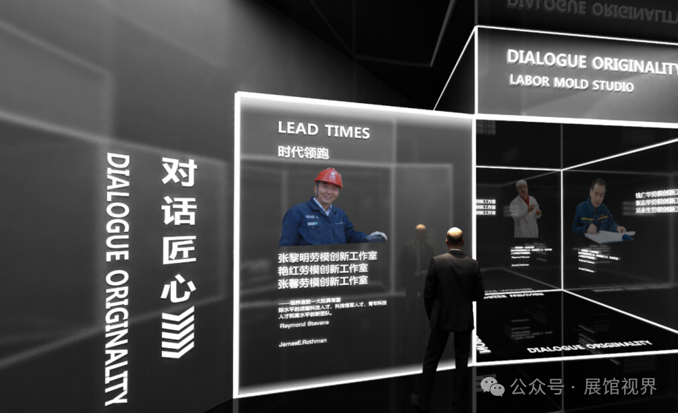 第三展厅为整个展示区域的重点区域。内容上,以新时代的劳模价值取向作为引领、全方位多角度反映时代“三种精神”精神特质。设计上,除了以红色、木色、白色作为整体基调以外,更加入了黑色与蓝色更富有未来与科技质感的元素,并充分利用建筑空间,尽可能地打造更符合时代特质的展厅。