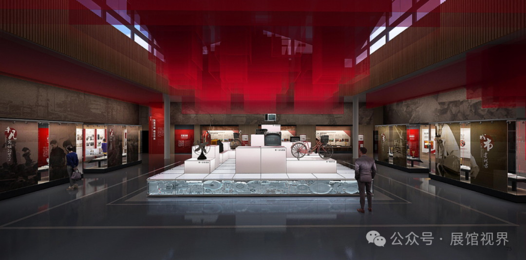 第一展厅整体采用开放式展示空间进行打造。当走过进门处的 “全国领航” 部分后,“海河荣耀七十年” 大型主题艺术装置便映入眼帘。两侧环形过道依次呈现主要展示内容。整个展厅的主色调为红色、深木色与白色,庄重典雅。四周的主题展板与整体空间装饰富有艰苦创业时期的年代特色,能让观众仿佛置身于那段激情燃烧的岁月之中。
