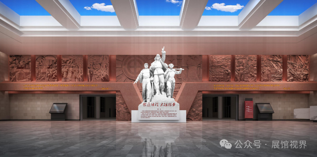 作为教育基地的入口空间,序厅整体围绕 “聚匠津门・大任担当” 这一主题展开设计,以天津劳动者群像序言雕塑营造出震撼庄重之感。此设计的重点在于充分体现天津劳动人民砥砺奋进、自强不息的优秀品质,生动展现他们勇于担当的精神风貌,有力彰显他们无愧时代的伟大情怀。