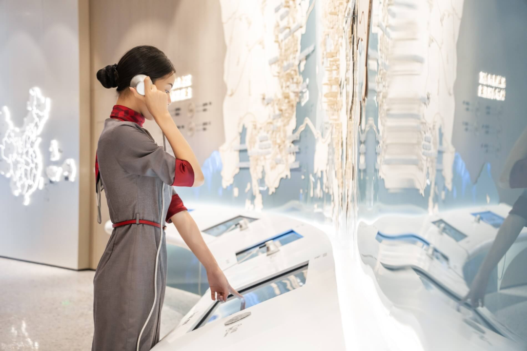 设计师通过信息技术媒介,把城市信息实时引入展厅之内,不仅为观者带来生动的观展体验,也拓展了空间尺度。观者通过听筒和触摸屏,可以聆听和了解湾区城市信息,实现与湾区城市之声的直接对话。