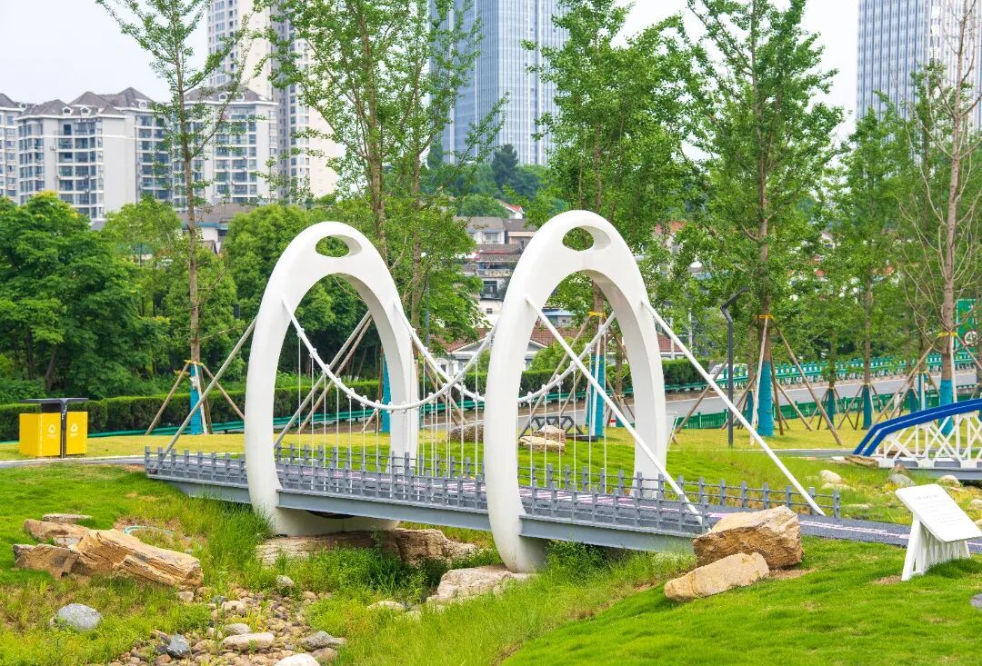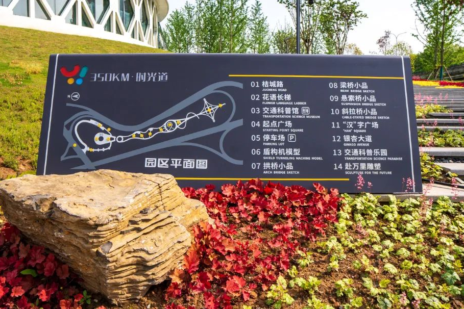 科普园将“交通”作为主题,以湖北省高速公路网——“两横四纵”为空间构图,以“沪渝”“沪蓉”两条高速主干道为园区主干道,以路、桥、隧等交通元素为设计灵感。园区由花语长梯、盾构机模型、汉字广场、交通科普馆等艺术版块组成。