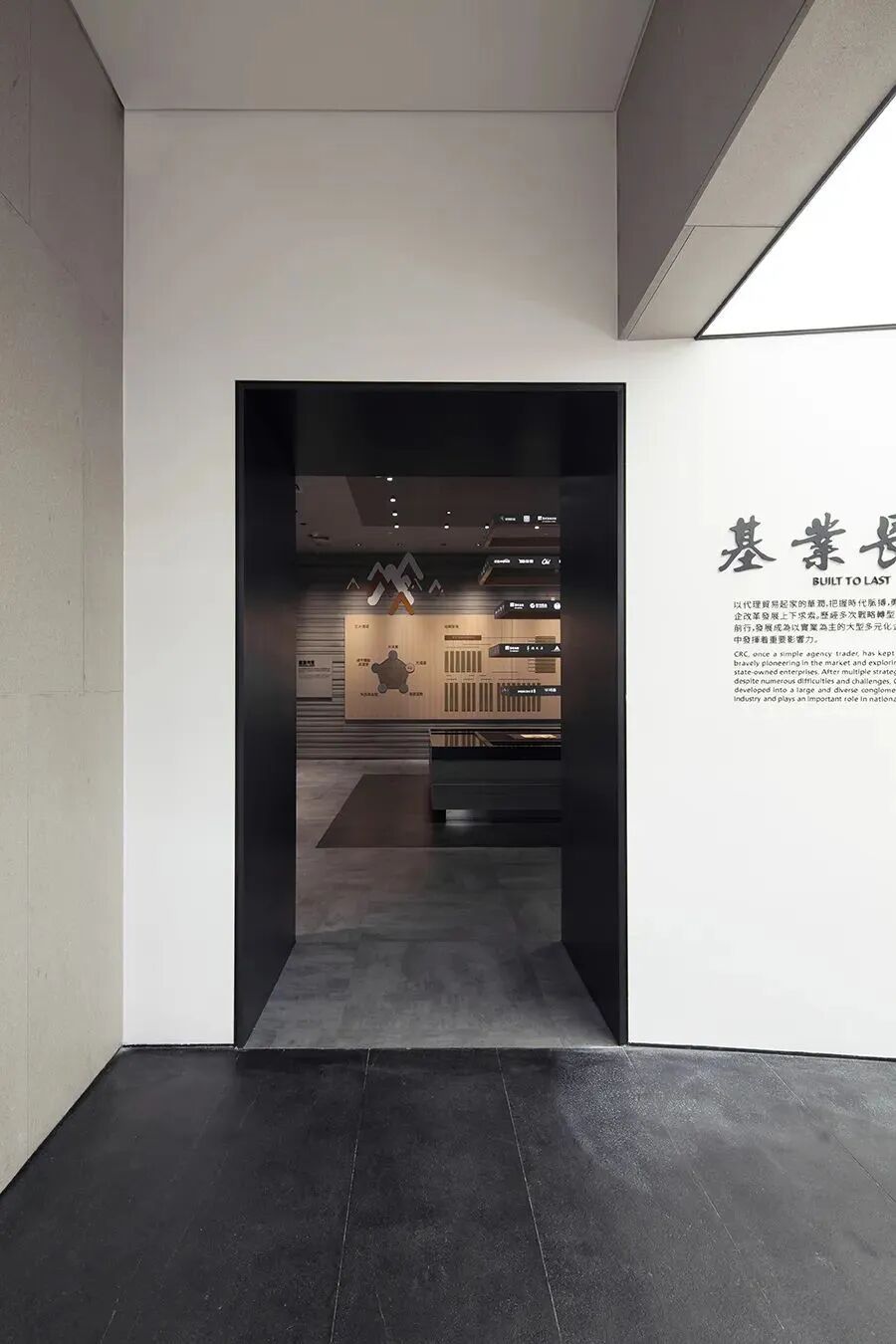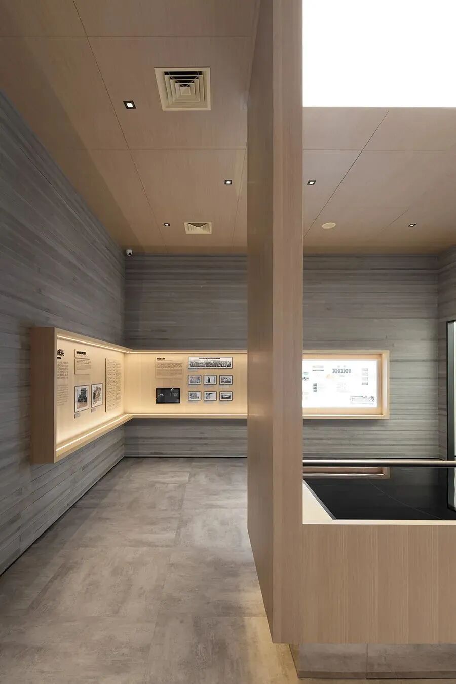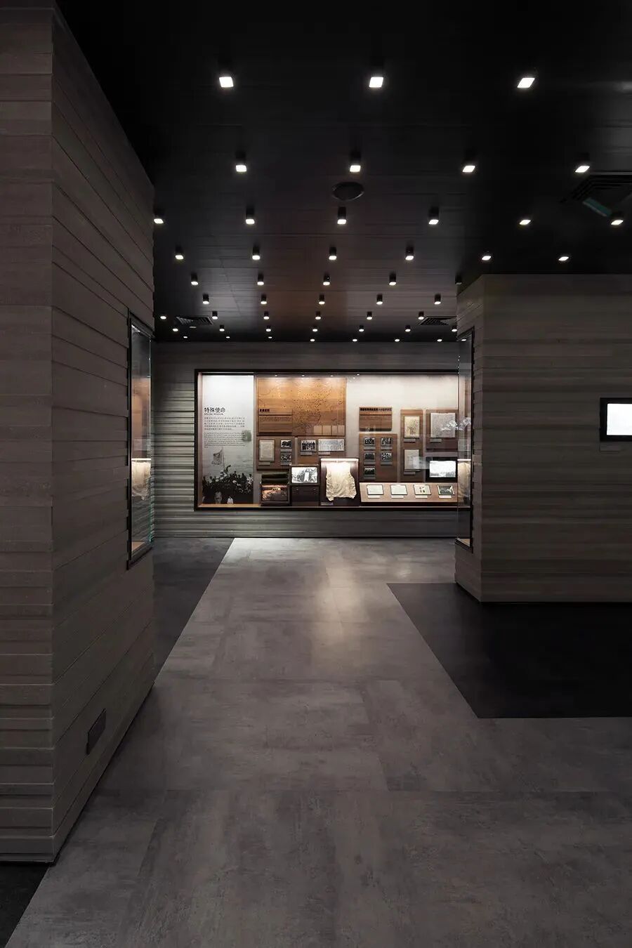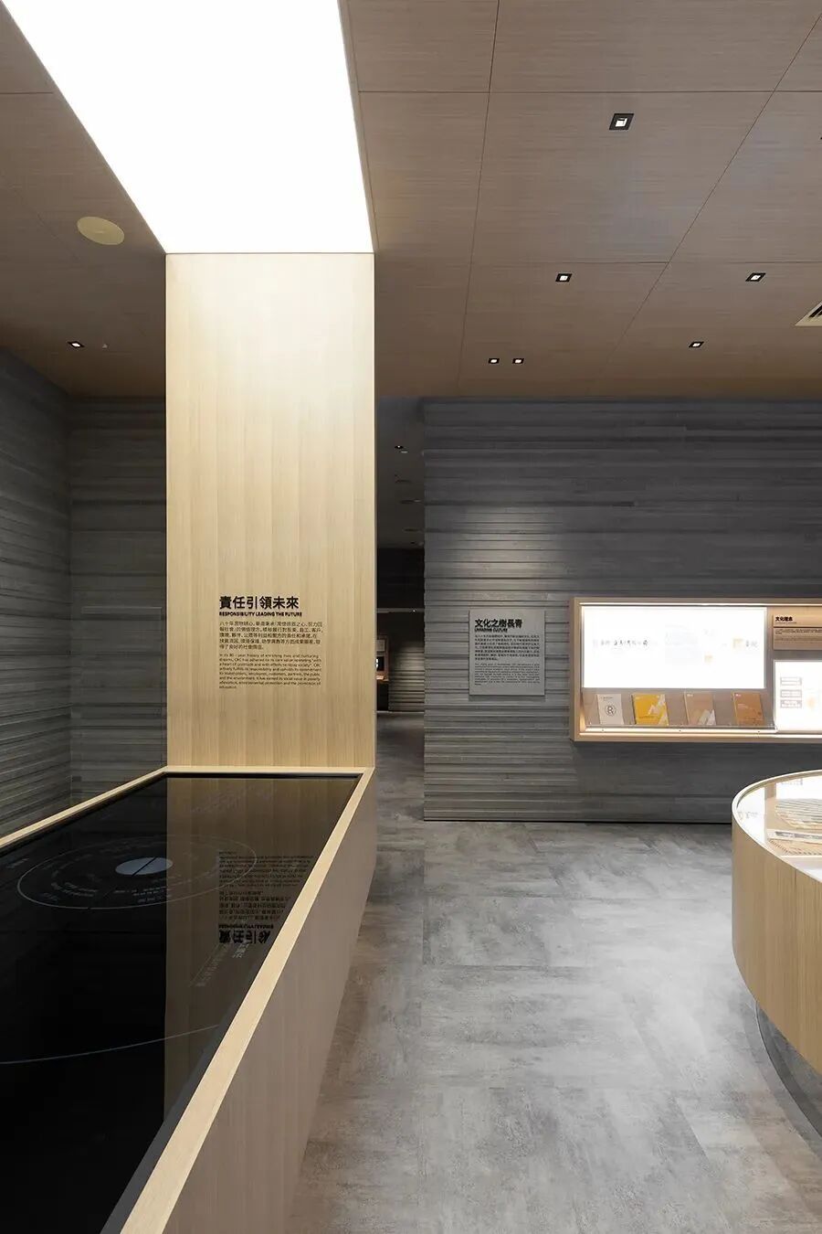 展示设计以多样而丰富的手法呈现以历史文档为主的展品,在空间中利用材质的过渡——由粗糙水泥至暖调木头搭配金属细节,巧妙呈现华润集团在不同历史时期与发展阶段的转变。幽暗至明亮的照明变化,在不同空间中营造出与故事线相互呼应的独特氛围,展示设计中确保了空间里每一处细节的设计都言之有物。