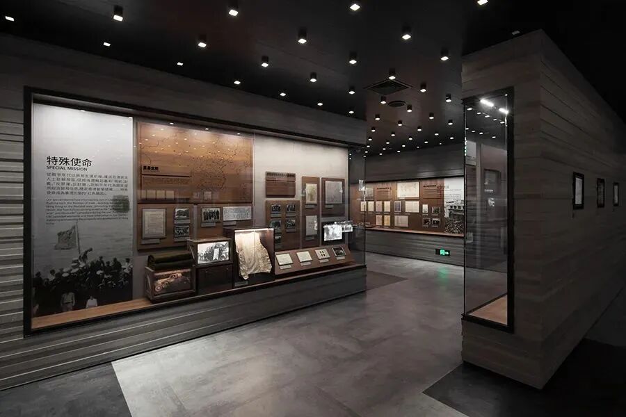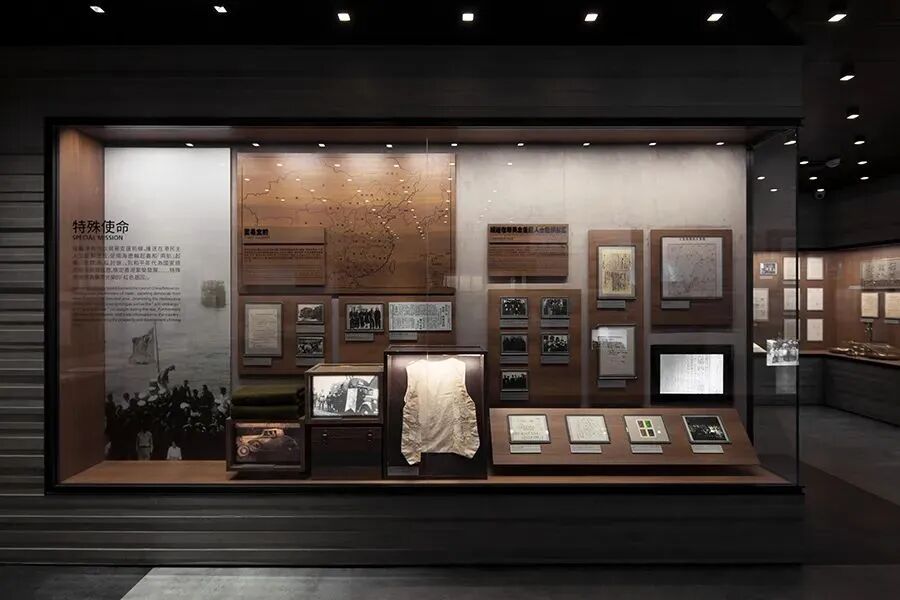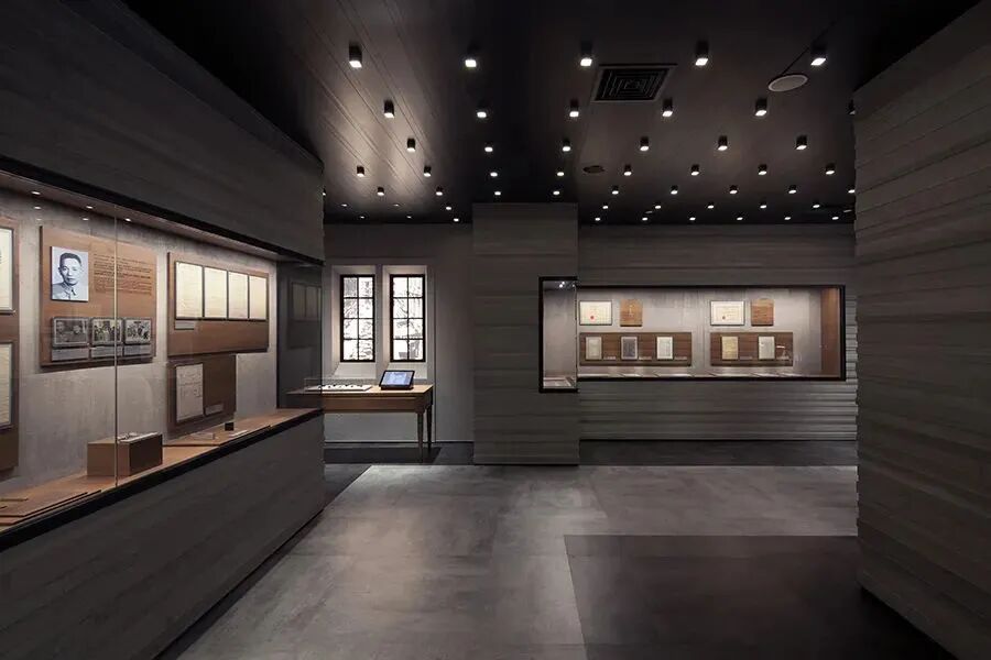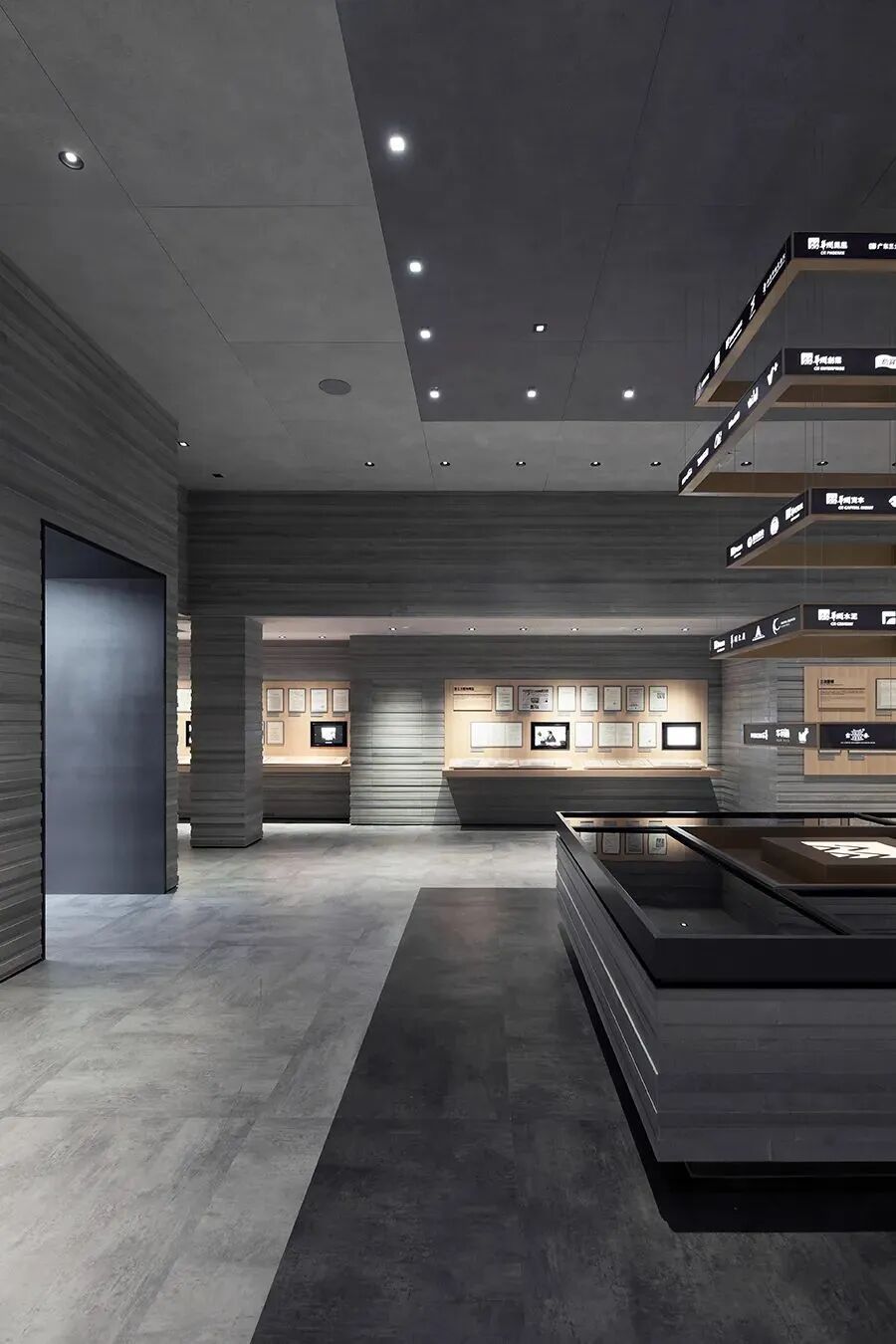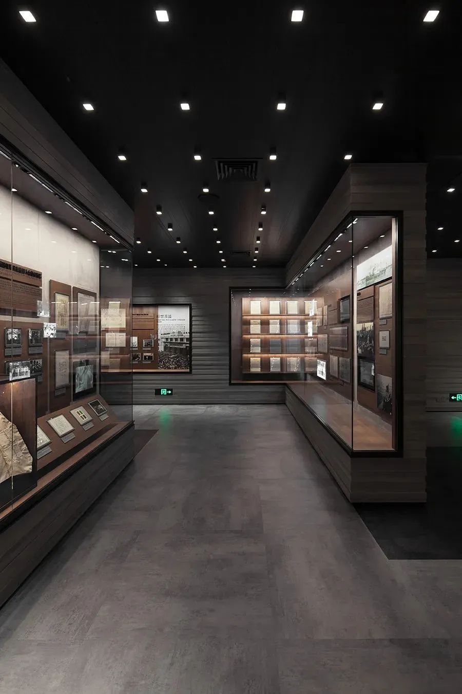 展示设计以多样而丰富的手法呈现以历史文档为主的展品,在空间中利用材质的过渡——由粗糙水泥至暖调木头搭配金属细节,巧妙呈现华润集团在不同历史时期与发展阶段的转变。幽暗至明亮的照明变化,在不同空间中营造出与故事线相互呼应的独特氛围,展示设计中确保了空间里每一处细节的设计都言之有物。