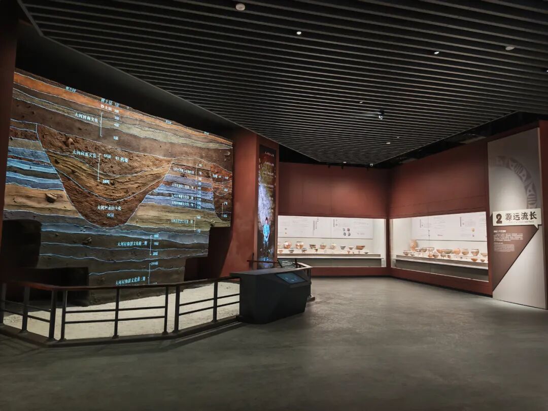 《仰韶文化标尺:大河村遗址》部分,以八大维度构建起大河村遗址立体叙事空间。分别介绍了大河村遗址的发现和发掘、地层堆积、优越的人居环境、先民的生产生活方式、聚落的演进、彩陶之美、墓葬、文化的交流融合。深入挖掘大河村遗址的独特价值,全方位展现先民的智慧、审美与社会风貌,让观众穿越时空,与历史对话,深切感受遗址独特的精神世界和深厚的文化底蕴。