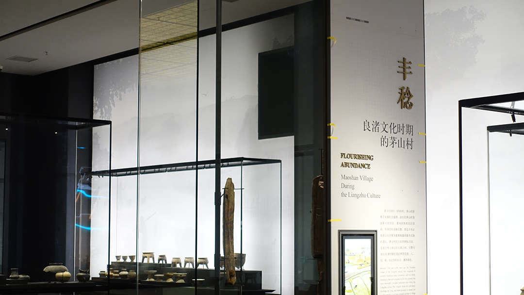 “丰稔:良渚文化时期的茅山村”单元,是茅山遗址厅的核心部分。通过建筑遗迹F8的复原模型,观众可以直观地感受良渚时期茅山村的居住环境。同时,对不同出土背景器物保存状态的介绍,以及随葬品性别差异的分析,深入且全面地展现良渚文化的社会风貌。