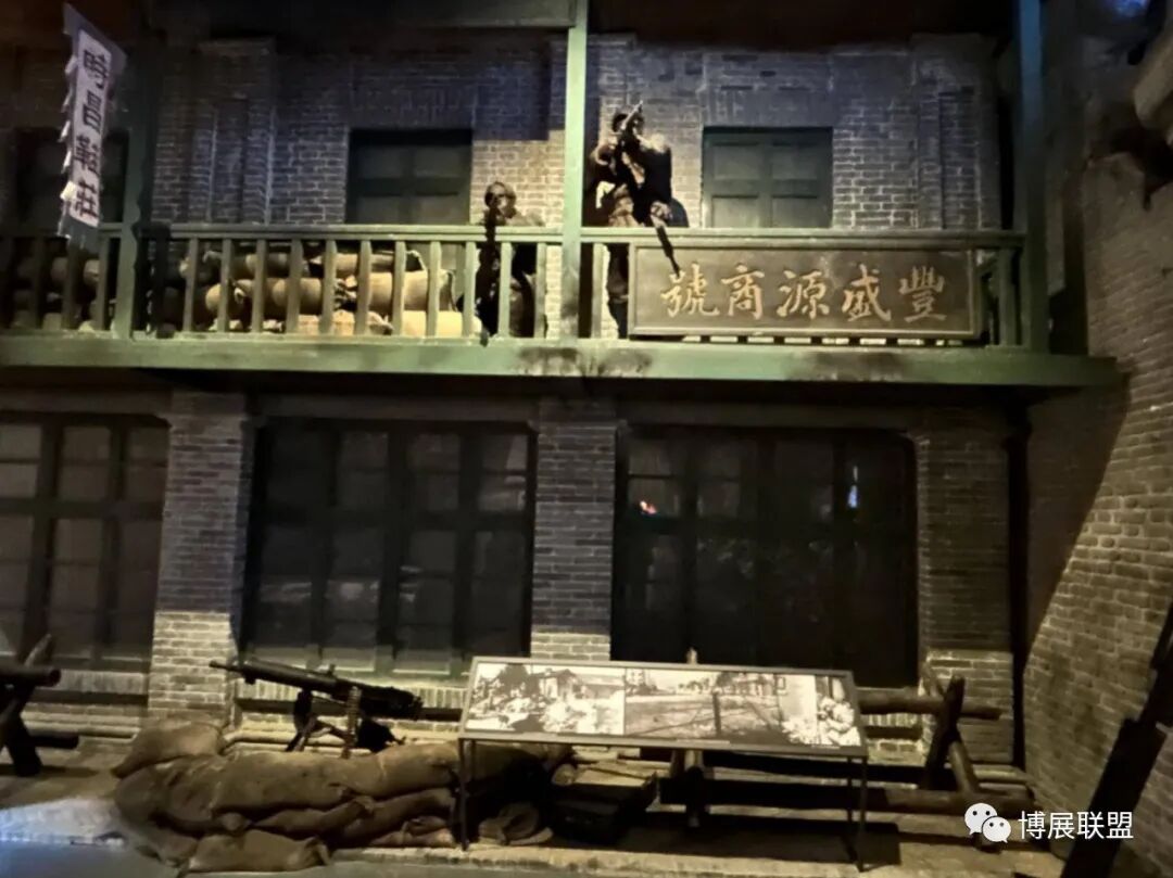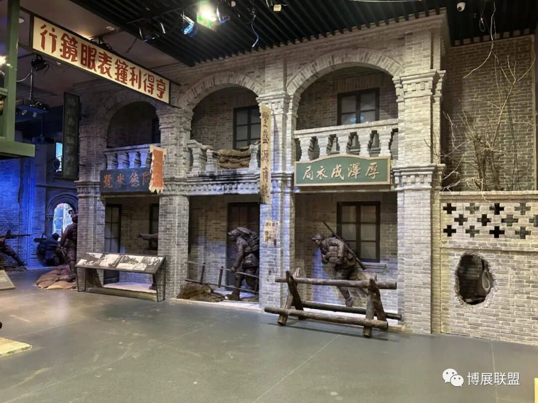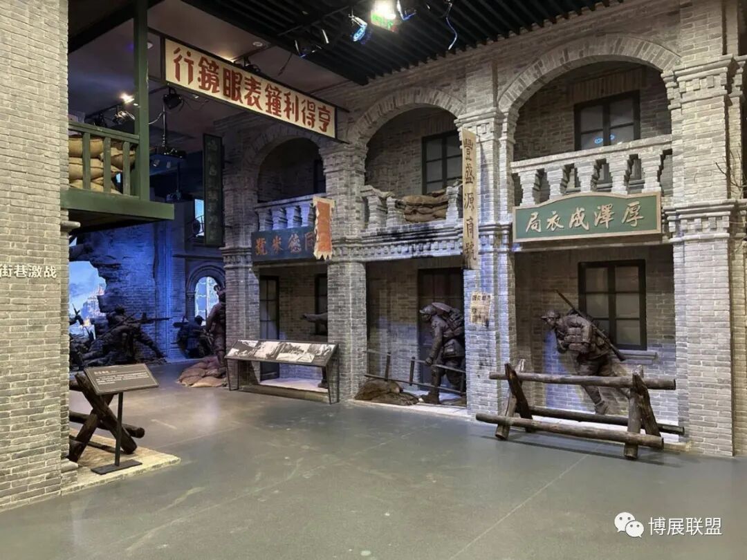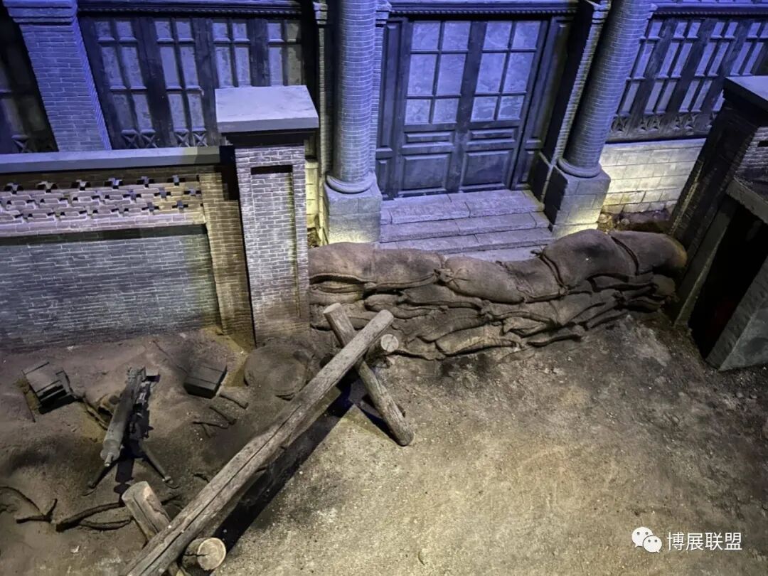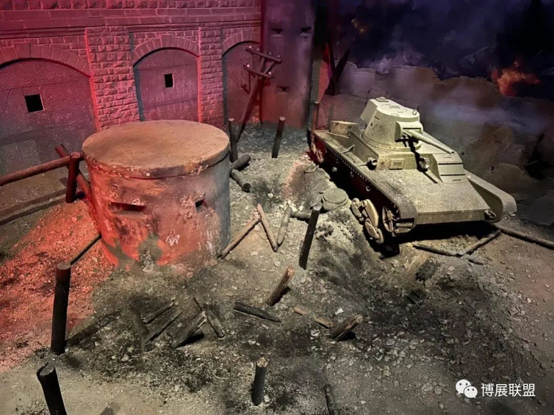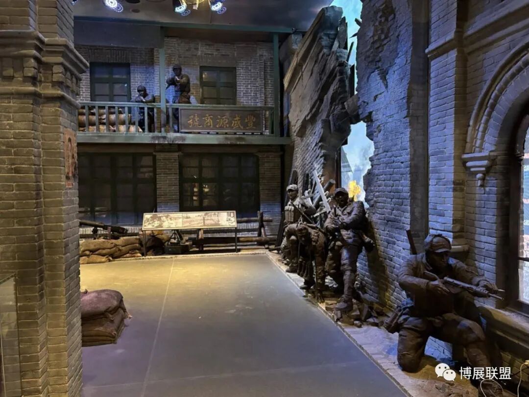纪念馆以解放石家庄的战斗为核心,沉浸式再现解放军战士与敌军激烈巷战、攻克核心工事的震撼场景。参观动线从巷战场景展开,两侧还原民国街景,残墙断壁为多媒体营造出强烈的战争氛围感;下沉式核心工事真实复刻当年战场,既提升空间纵深感,又为本地建筑特征复原留出充足空间,细节处植入老招牌、旧家具、街区设施等元素,强化观众沉浸式体验。攻克核心工事区域,1:1复原大石桥、正太饭店等关键工事,周边布置沟壕、碉堡,搭配损毁军车、坦克与武器装备,直观呈现当年攻坚战术,彰显解放军英勇克敌的战斗精神,以纪实性、沉浸式设计让观众深度代入历史现场。