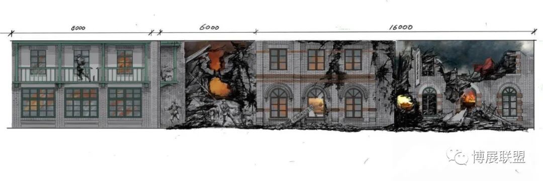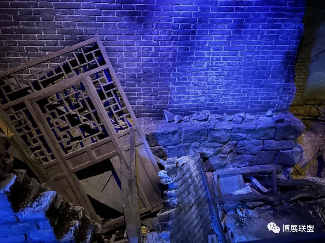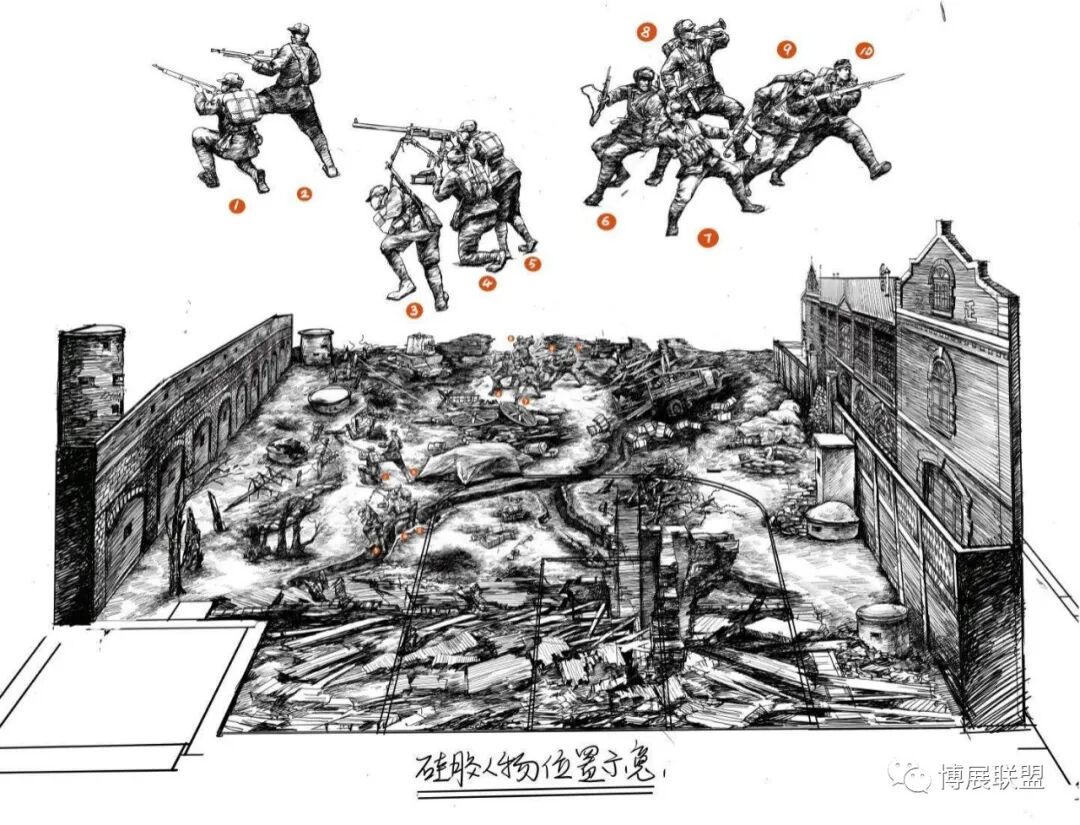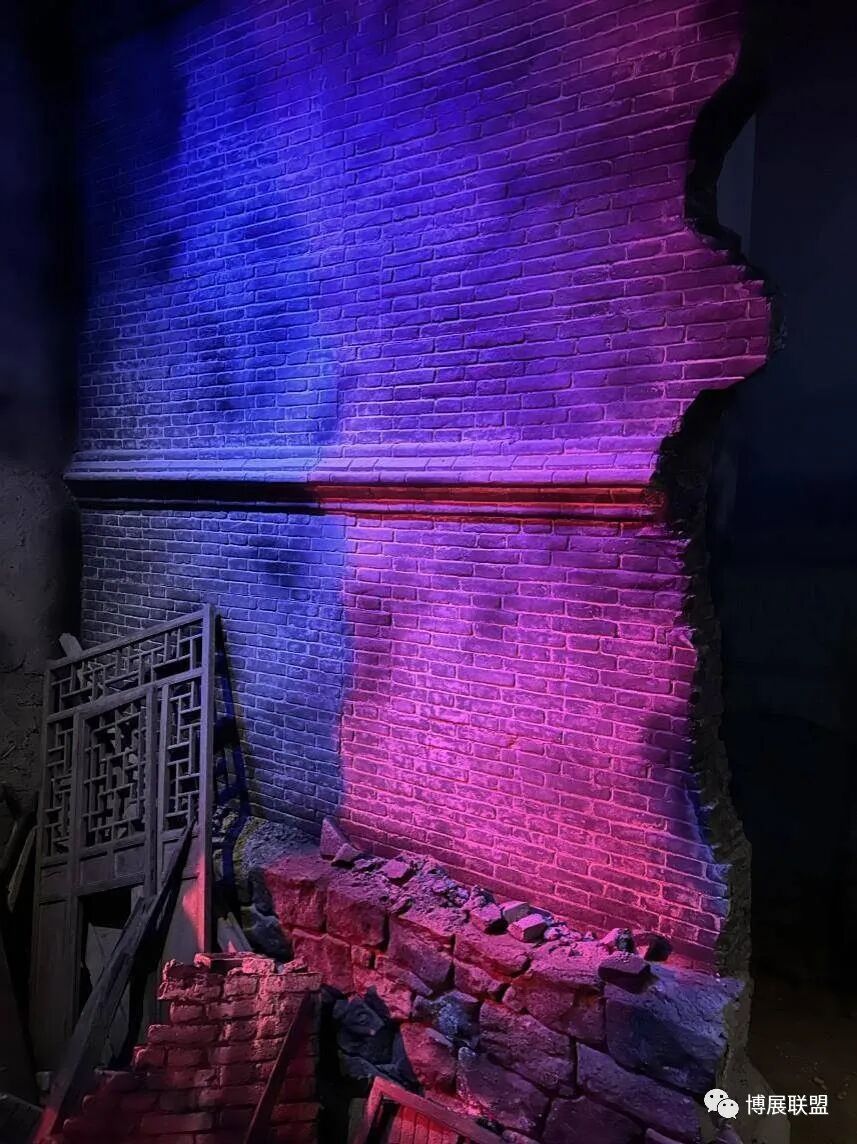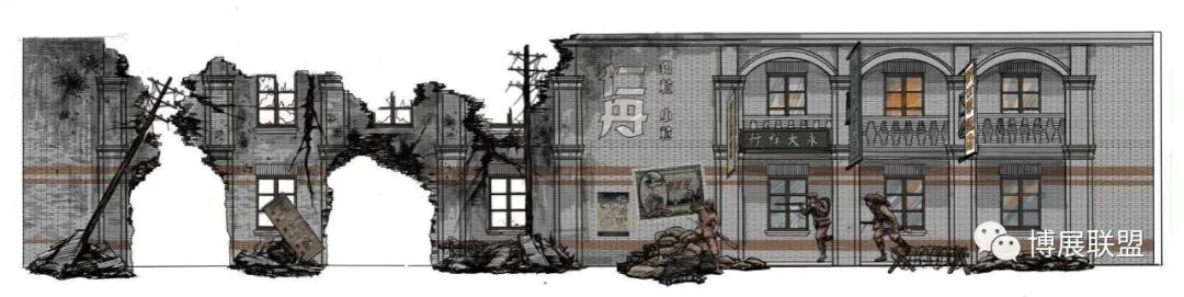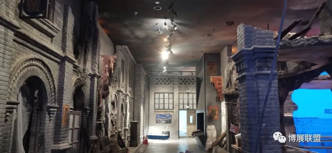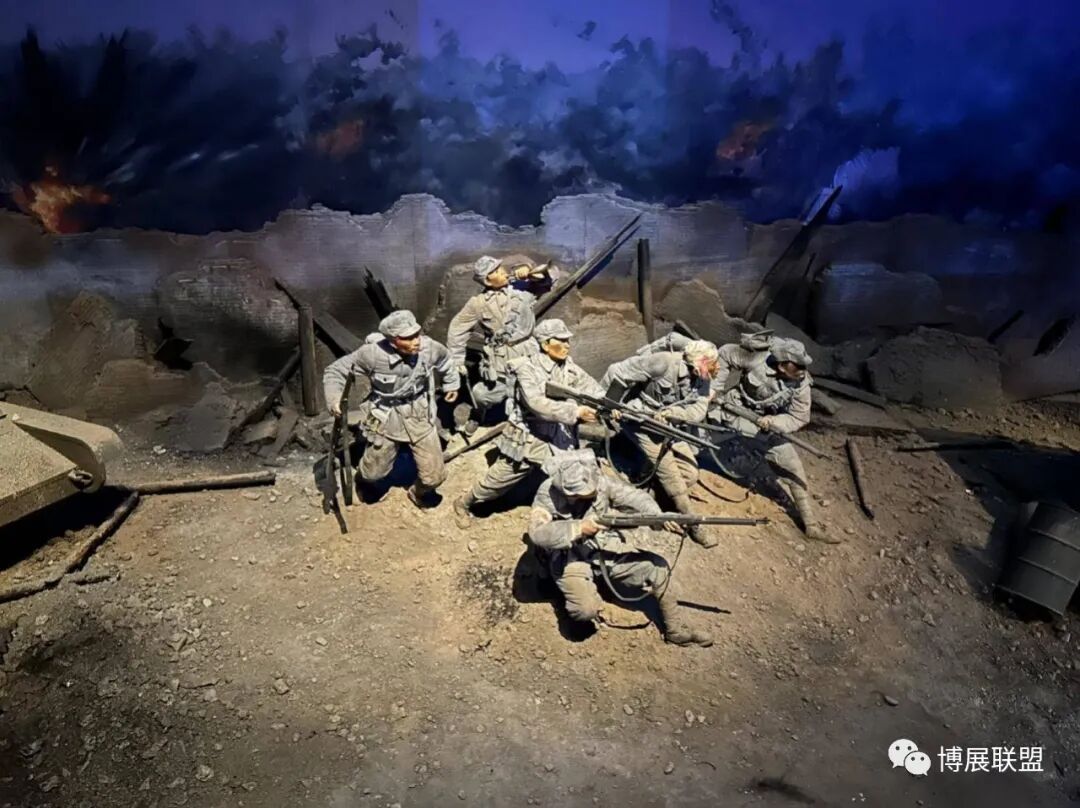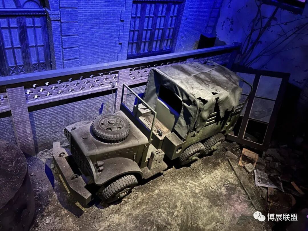 纪念馆以解放石家庄的战斗为核心,沉浸式再现解放军战士与敌军激烈巷战、攻克核心工事的震撼场景。参观动线从巷战场景展开,两侧还原民国街景,残墙断壁为多媒体营造出强烈的战争氛围感;下沉式核心工事真实复刻当年战场,既提升空间纵深感,又为本地建筑特征复原留出充足空间,细节处植入老招牌、旧家具、街区设施等元素,强化观众沉浸式体验。攻克核心工事区域,1:1复原大石桥、正太饭店等关键工事,周边布置沟壕、碉堡,搭配损毁军车、坦克与武器装备,直观呈现当年攻坚战术,彰显解放军英勇克敌的战斗精神,以纪实性、沉浸式设计让观众深度代入历史现场。