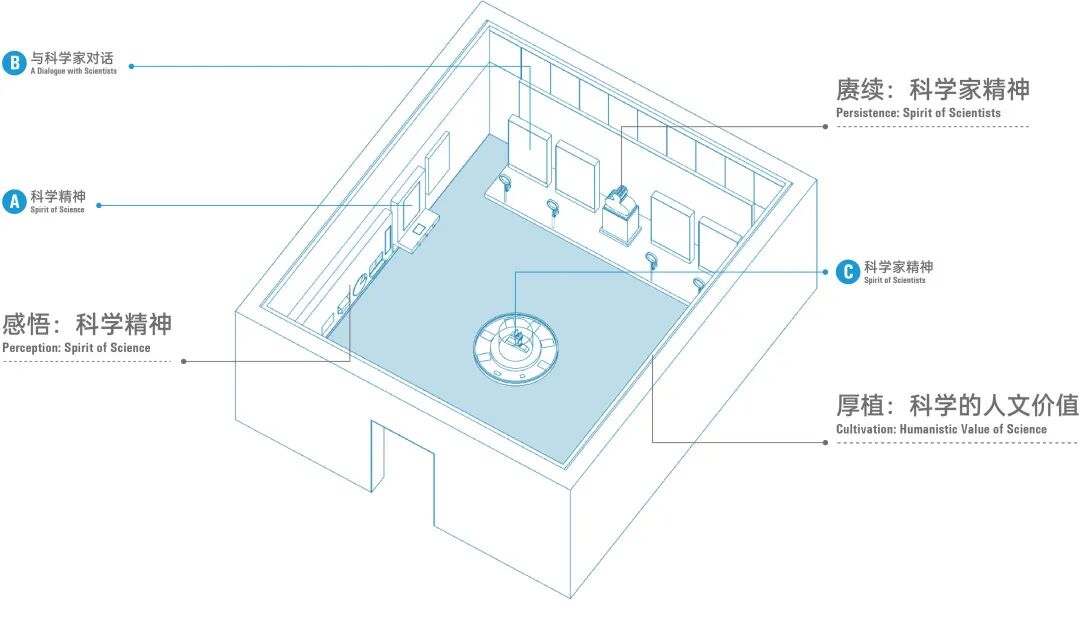 本展厅以精神殿堂为设计灵感,选用蓝色和白色为主色调,营造出冷静、深邃的氛围,打造一个充满人文气息的科学空间。我们将从科学精神、科学家精神和科学的人文价值这三个维度,全面展现科学的人文精神,揭示科学背后的人文关怀和价值追求。期待这一主题引发科学共同体及社会深切的关注与思索。