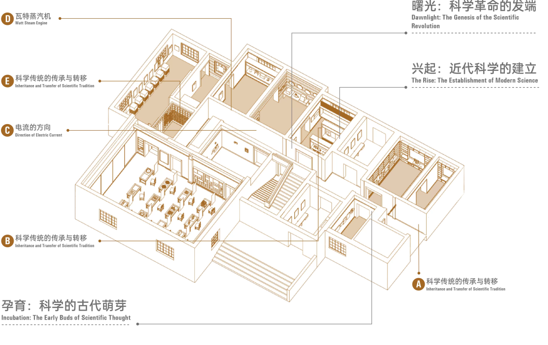 本展厅以科学档案室为设计基调,打造了一个充满历史感的空间。整体以时间为脉络,以科学家的研究为主线,系统地展示了从古代的科学萌芽到19世纪末整个科学体系建立的过程。回顾科学历程,我们可以追根溯源,了解知识的认知过程,理解科学从何而来。