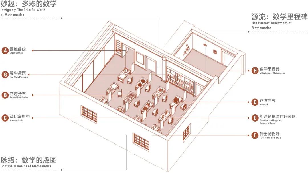 This exhibition hall is themed as a "Mathematics Classroom," incorporating elements such as blackboards and desks in a creative way. By flexibly integrating embedded exhibits and display-oriented design, it enhances the exhibition’s coherence while offering a deeper interpretation of the essence of mathematical thinking.