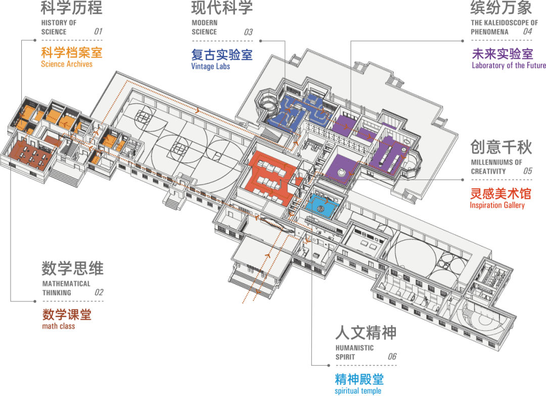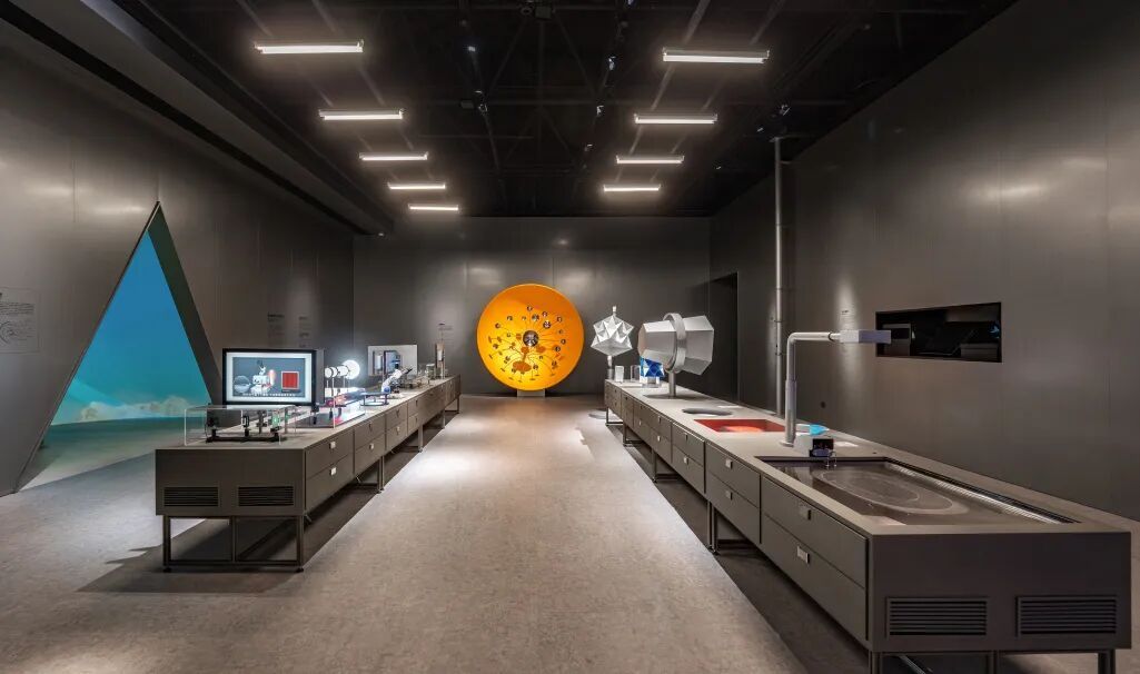 项目的核心设计理念是“空间即叙事”,通过情境化的空间体验,让科学不再是抽象的概念,而是可见、可触、可感的现实。展览围绕6大主题展厅展开,包括科学档案室、数学课堂、复古实验室、未来实验室、灵感美术馆和精神殿堂。每个展区都采用不同的空间语言,通过多维度的视觉、触觉和互动体验,讲述科学的发展历程,让观众在沉浸式体验中理解科学的本质。