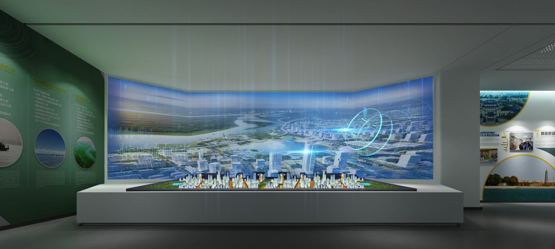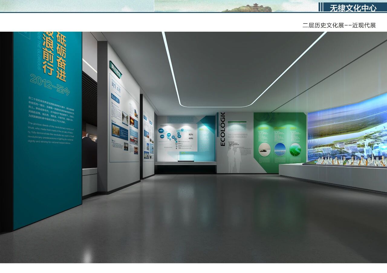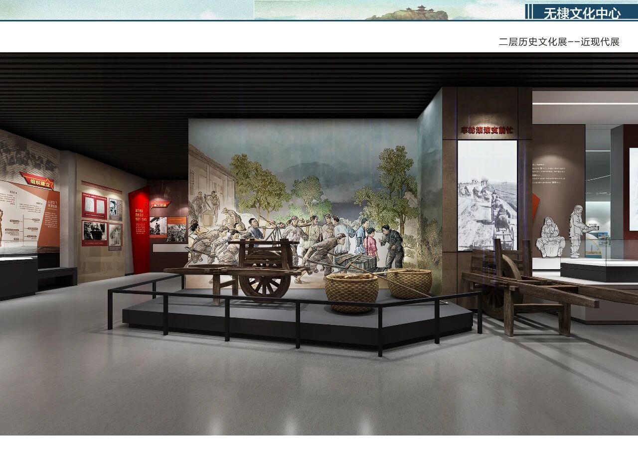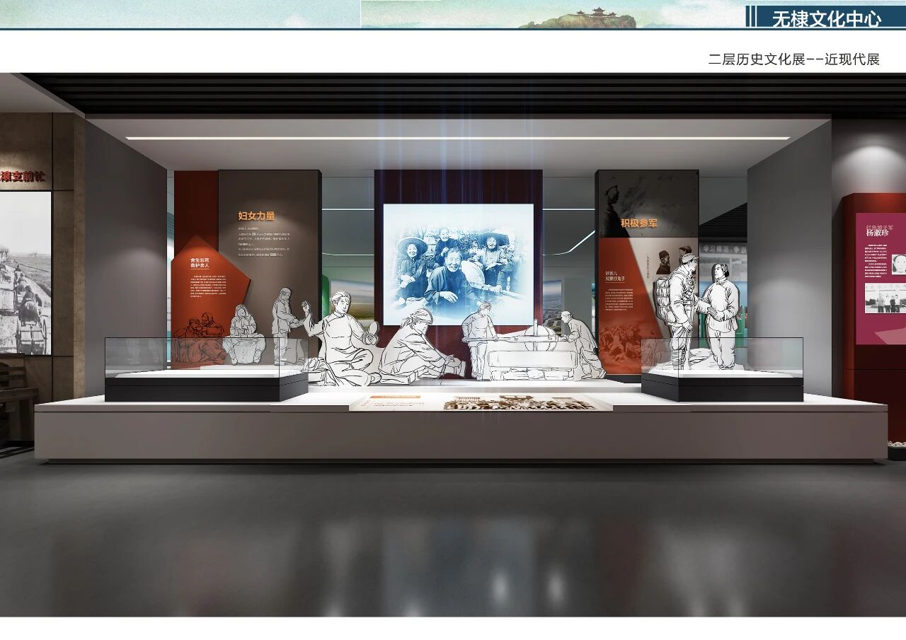 近现代展厅以“奋发百年 华彩无棣”为主题,通过模块化可移动展墙与沉浸式场景还原,再现红色革命、农业治水、改革开放的壮阔历程。锈蚀钢板与暖木色调碰撞,隐喻历史厚重与时代新生;数字沙盘与老照片档案交织,让观者在虚实交错中触摸城市记忆。