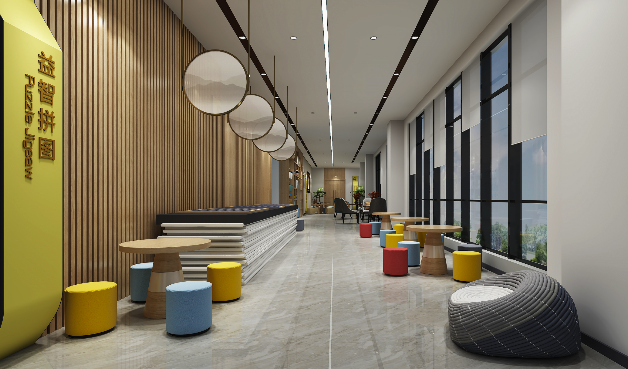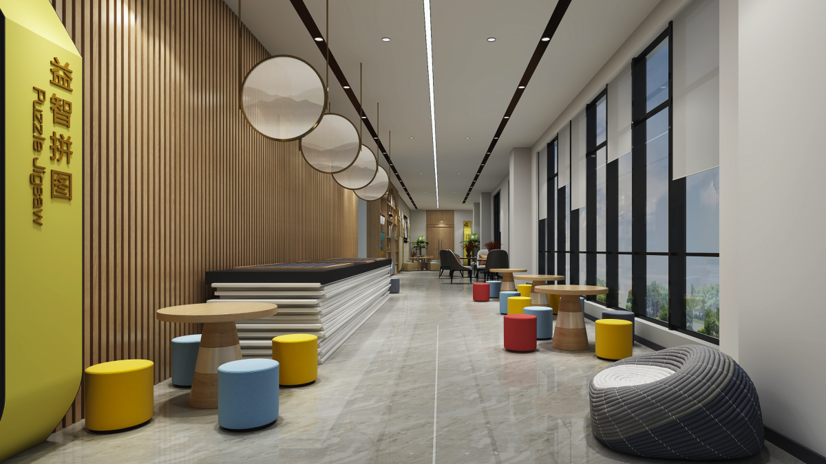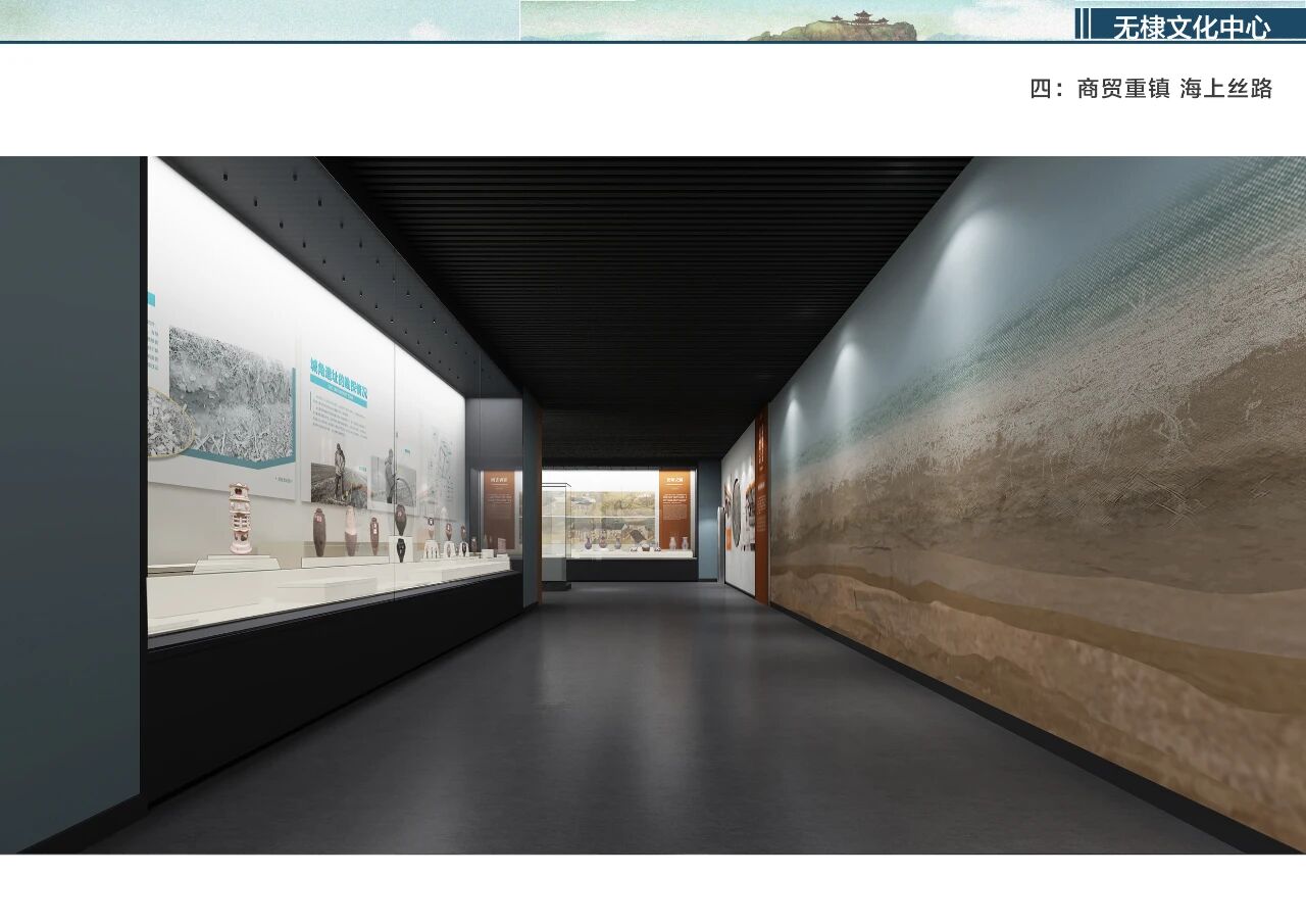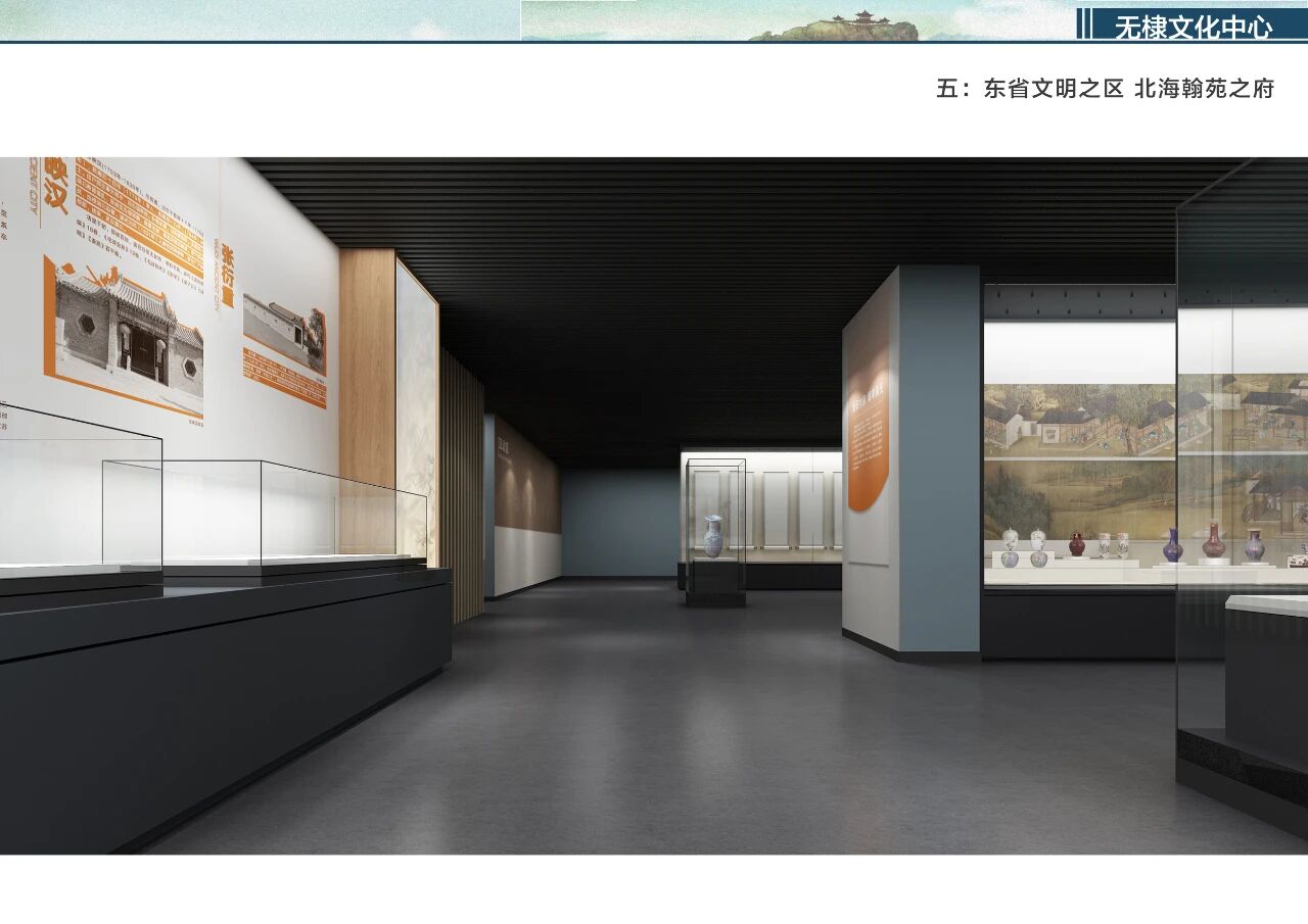 无棣文化中心不仅是展陈空间,更是一座“活态博物馆”。设计团队以“人本”为核心,将教育、休闲、文创等功能无缝嵌入:纪念品商店中,海瓷艺术品、枣木雕、芦苇画等非遗文创,让文化“可带回家”;中厅临时展厅模块化轨道设计,灵活适配各类主题展览;顶层互动区“妙手生花”,青少年可化身“文物修复师”,在游戏中树立保护意识。