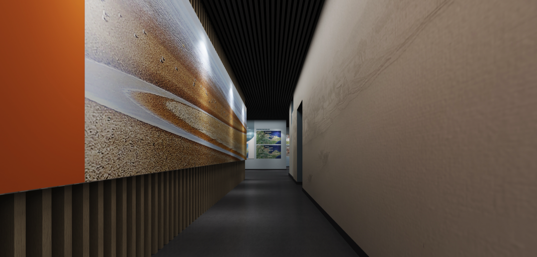 设计以“水”为脉,顶部采用木纹不锈钢板与柔光玻璃,勾勒出黄河奔涌的意象。主题上提取古代煮盐、海浪、海丰塔等元素,以海浪、古塔、儒家文化为灵感,形成“儒风无棣”“非遗万象”“海盐遗韵”三大主题墙面。光影流转间,游客仿佛置身流动的时空长河,感受无棣“依河傍海”的生态底蕴。