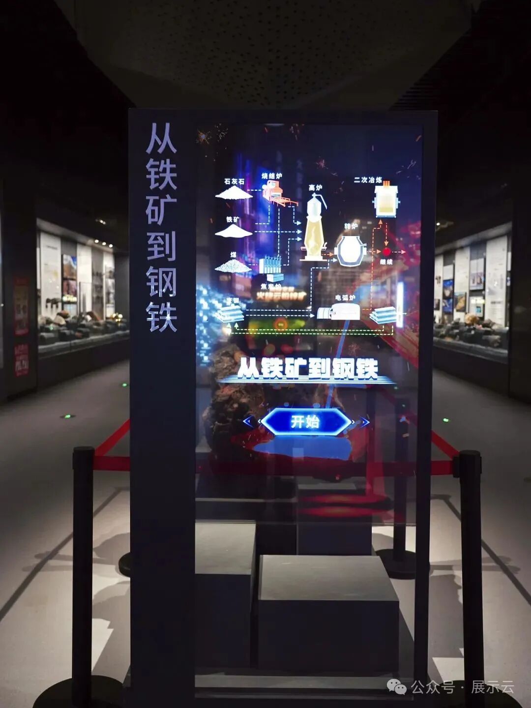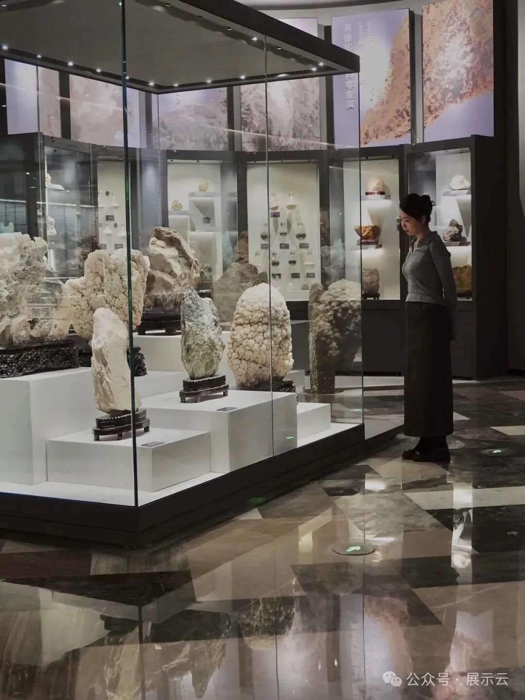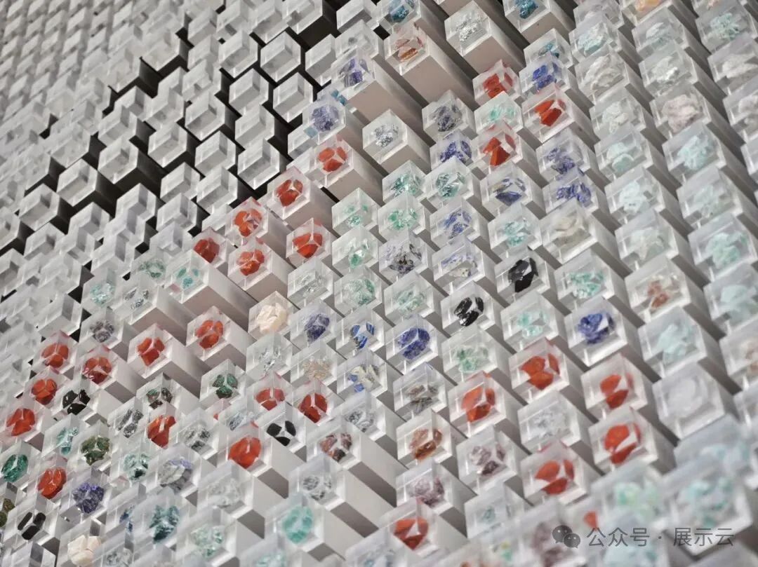 值得一提的是,石矿展出区域的地砖也是由不同种类的石材制作而成。踩在颜色各异的地砖上,眼前是被运用在各类场所的石矿,很奇妙的体验。