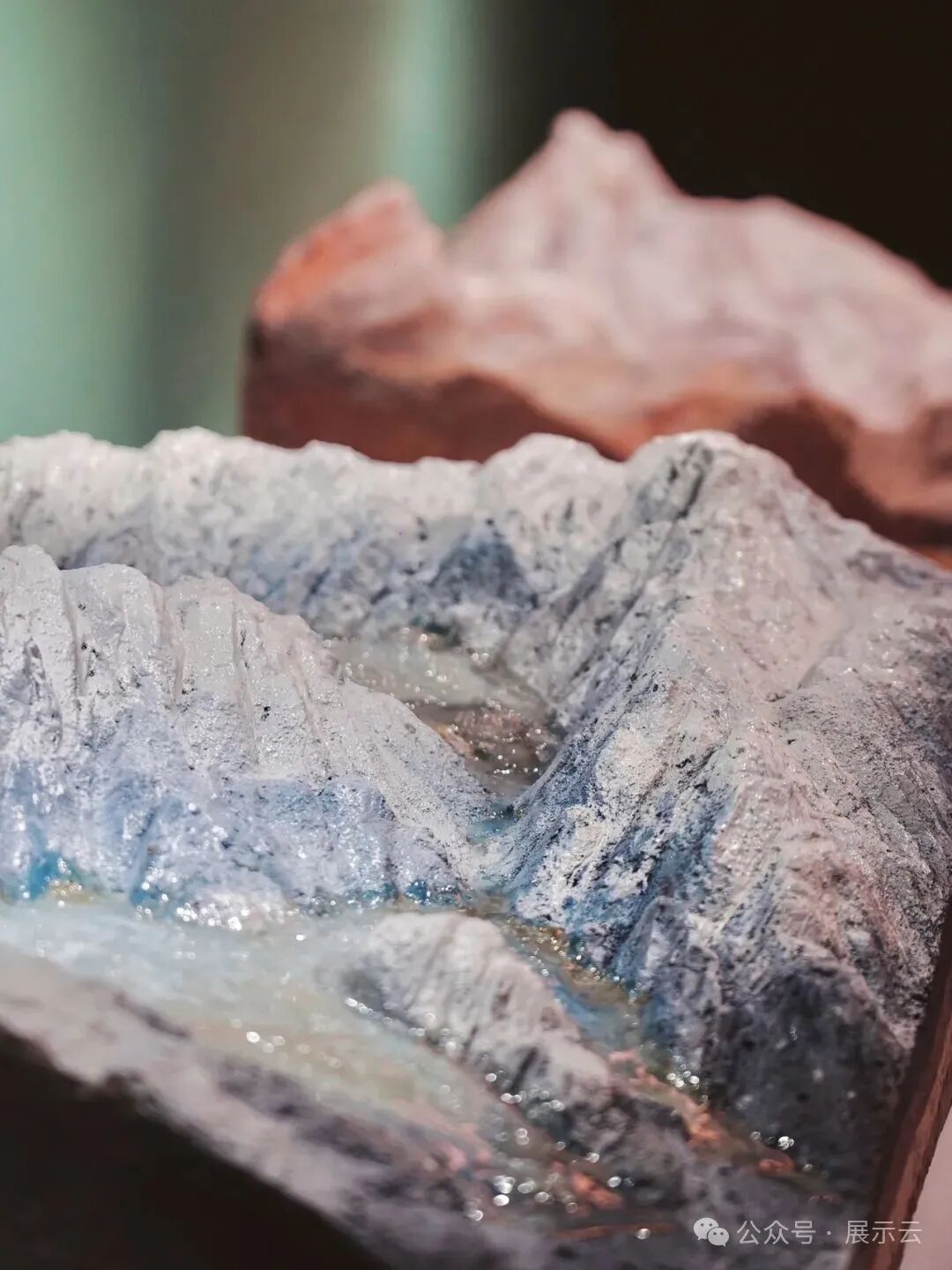 进门便看到由一万多块人造水晶组成的新疆版图水晶墙。细看每一块里都“暗藏玄机”,是 153 种新疆矿产矿石,每一块都是真矿石。震撼之余,不由感叹:不愧是新疆!