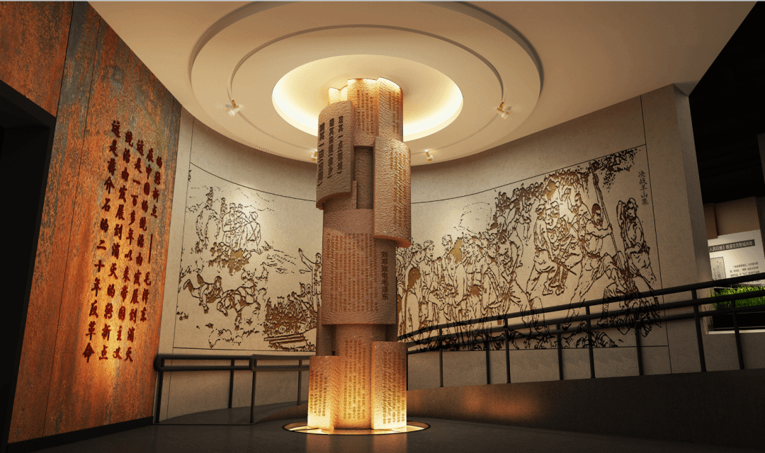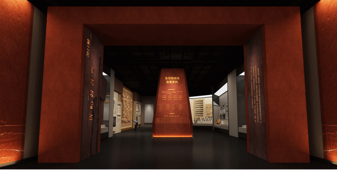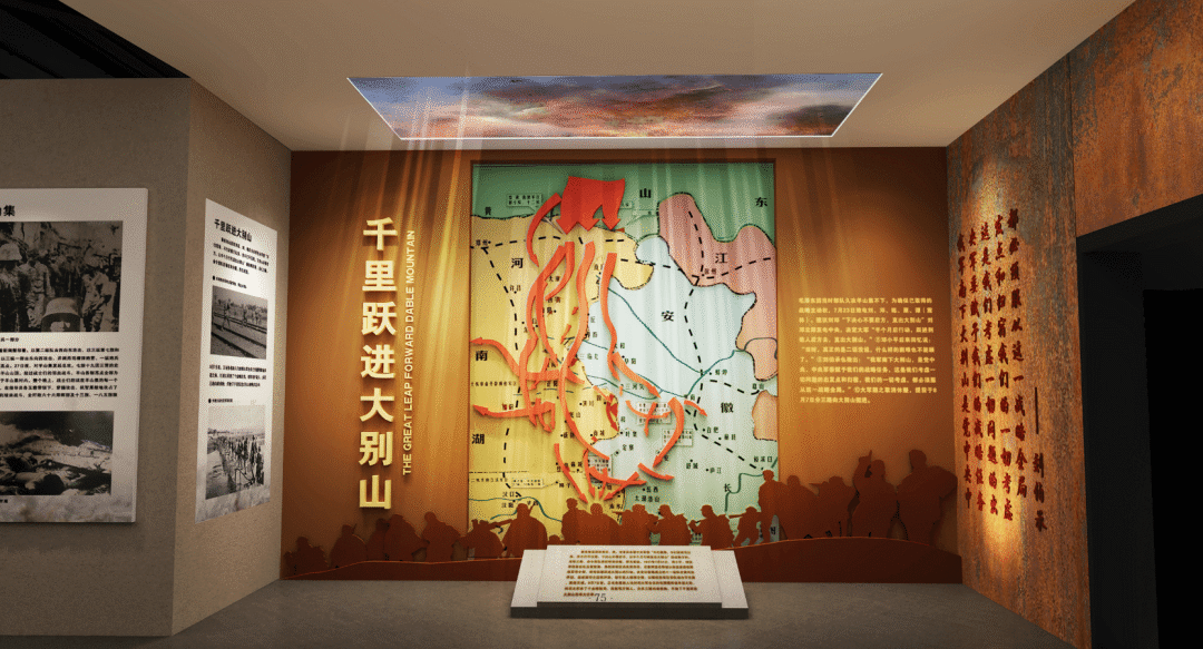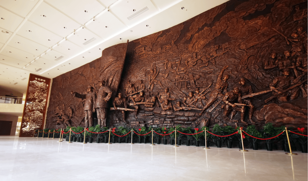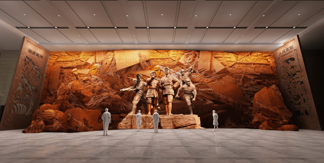 以大型浮雕为背景,中央设置以刘邓首长为中心的群雕,钢板镂雕作为空间分割,展陈空间层次丰富,展陈氛围浓厚。