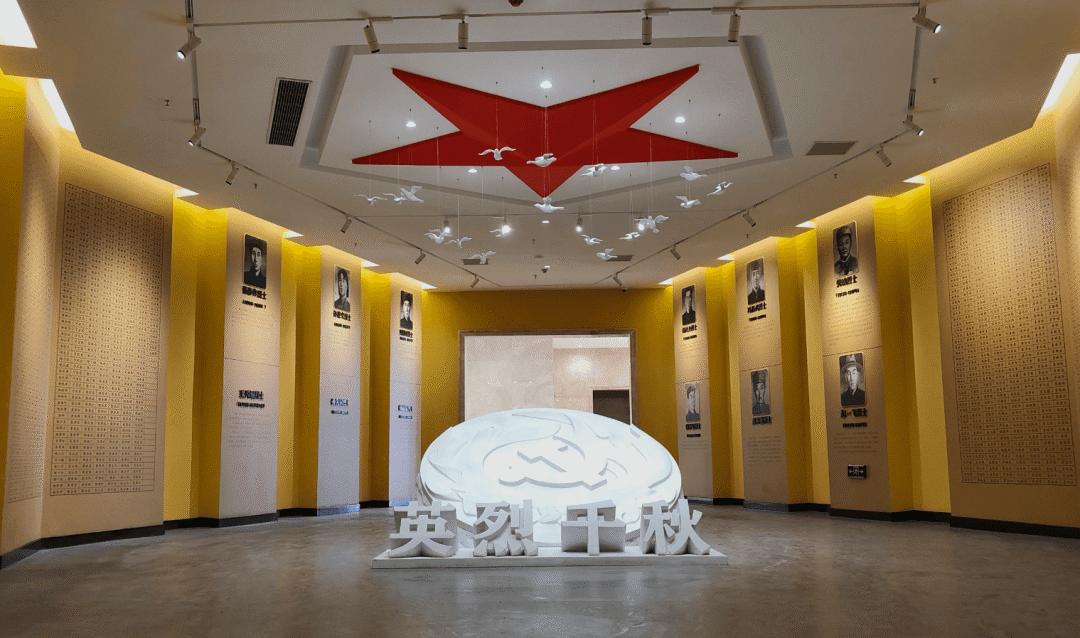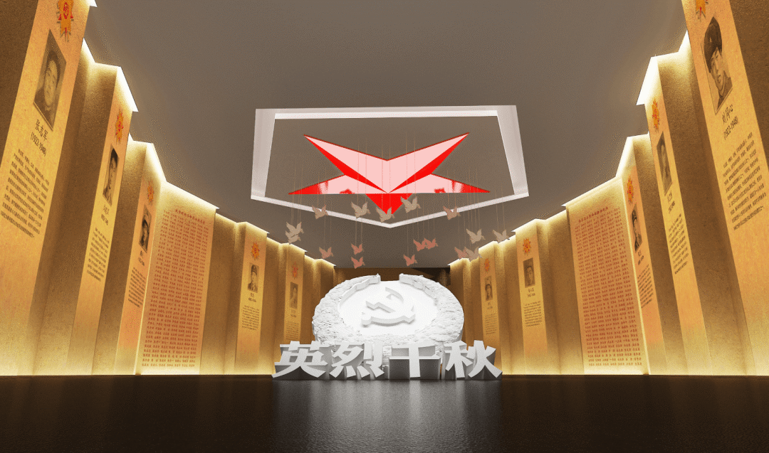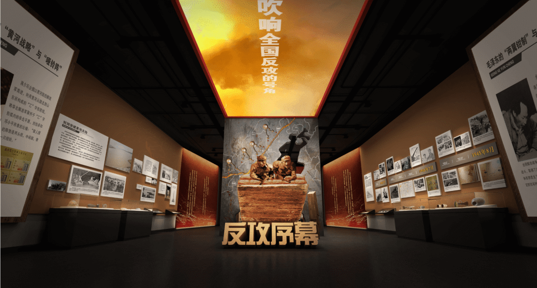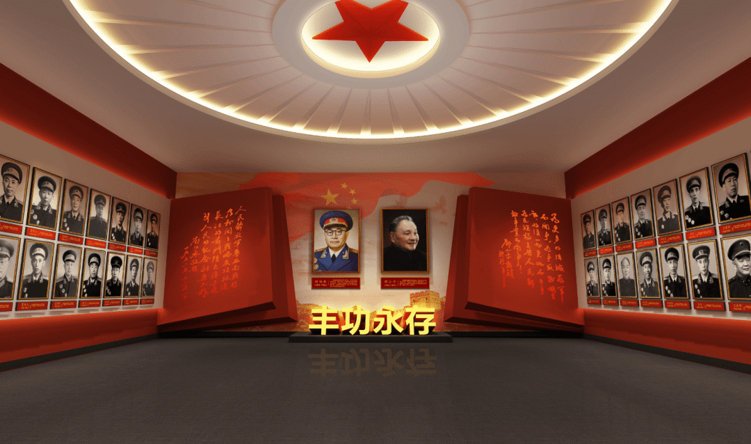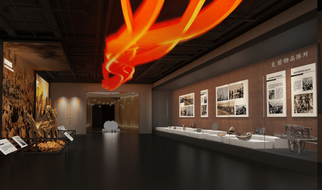以大型浮雕为背景,中央设置以刘邓首长为中心的群雕,钢板镂雕作为空间分割,展陈空间层次丰富,展陈氛围浓厚。