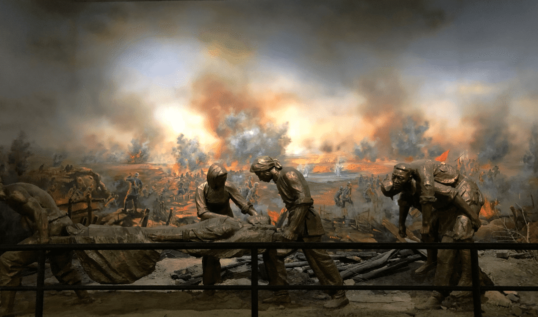 藉史料记载,深入实地考察建筑结构、村落布局,利用中庭还原指挥部原貌。浮雕壁画装饰四周墙面,再现当年激烈战斗的过程。