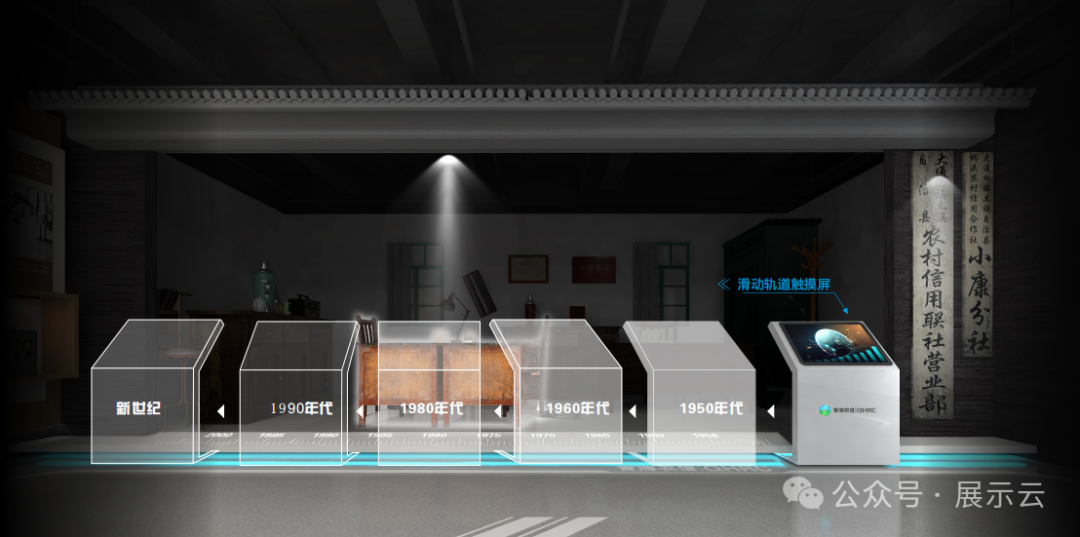 (将现有收集的老物件进行优选组合形成情景,通过移动前端轨道触摸终端,对应至地面年代标尺,顶面暗藏灯光对区域内所在年代的物件进行灯光追踪、形成聚光效果,增添老物件的观看仪式感并可在触摸屏查看该物件的背后故事)