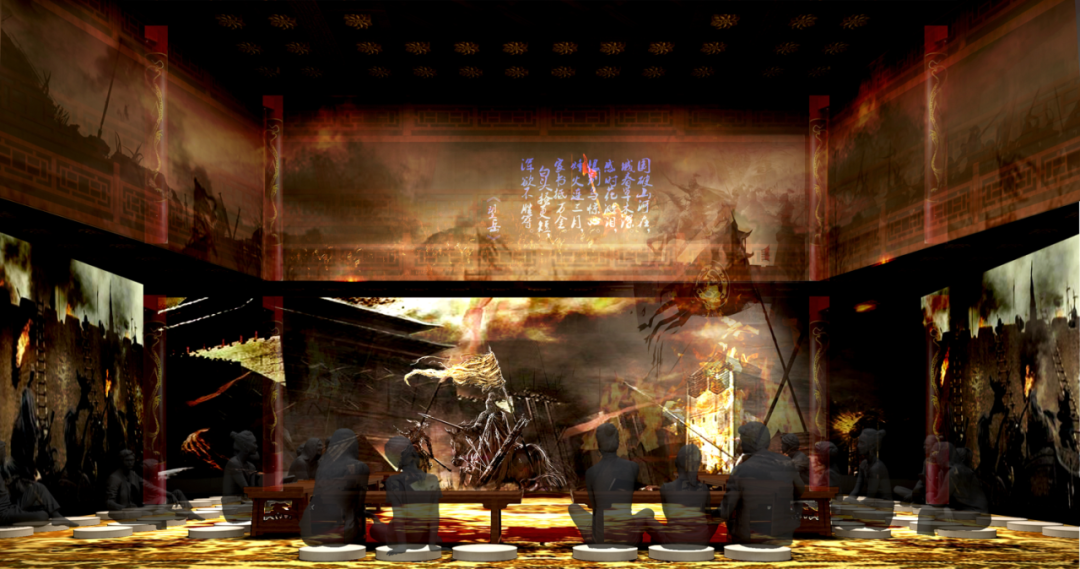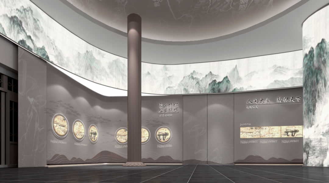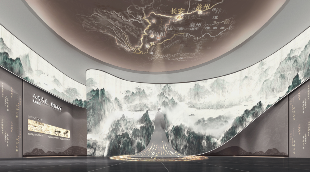 背景为杜甫江阁的艺术画卷,顶部从古岳州到古潭州的百里湘江图绕展厅一周,定格在湘江边上的江阁,如同杜甫胸怀天下的一生定格在古潭州的最后一刻。整个画卷采用柔性LED,动态画面风格宛若淸明上河图,青山不动,水动人动,一叶小舟顺江直下,传达江山不改绿水长流的唯美境界。中间杜甫采用后现代艺术雕塑,树立高大的艺术形象!顶部采用大唐开元盛世的江域图,与仰望天空的杜甫互映,表现杜甫胸怀天下的伟大情怀。