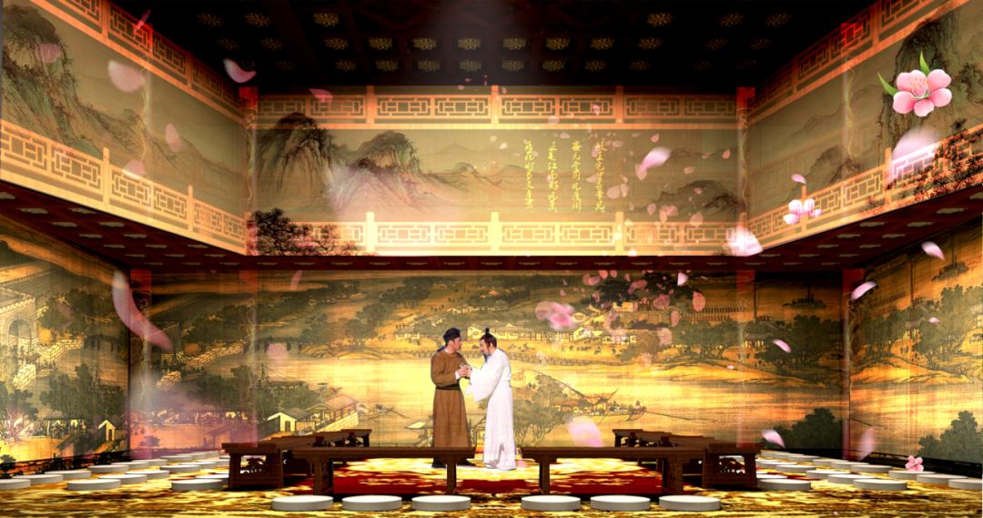 首先观赏约3分钟歌舞表演,四周和地面用沉浸式投影投出祁王府画面,同时配合4名真实的舞者现场表演。二楼幕布拉开,青年李龟年敲击羯鼓演唱出场,曲乐到达顶峰之时,舞台一侧的青年杜甫也类似我们观众在认真欣赏,情境交融,形成艺术升华。