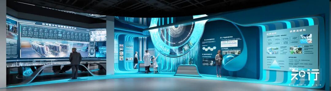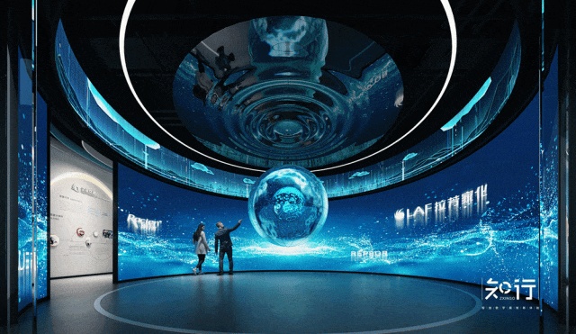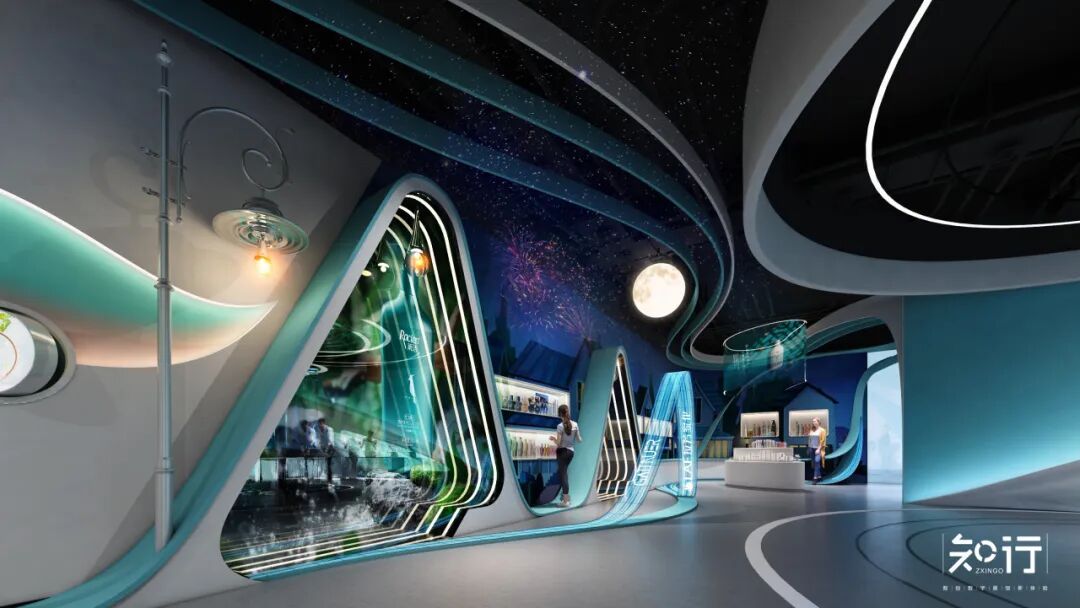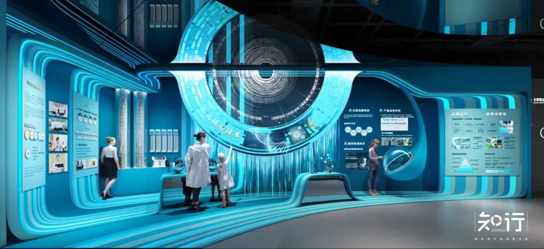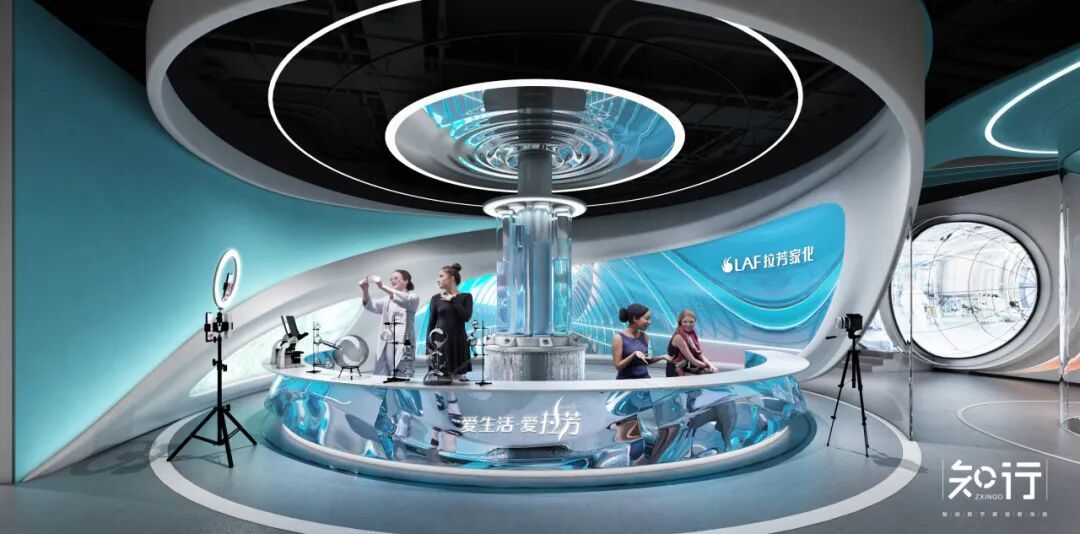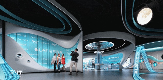 空间整体造型取自宇宙概念,流线元素结合光电技术手段,天花地面墙面一体化,给人以空间交错之感,构筑一个沉浸式星河“未来幻象”,引导参观者向内探索;环形屏幕主要展示核心技术,灵感来源于宇宙星系,无限创造的源泉,凸显企业研发将为拉芳家化持续赋能的理念。