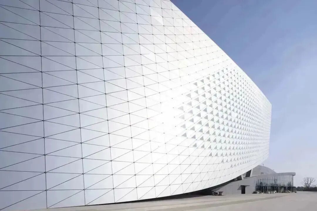 苏州湾数字艺术馆外立面采用菱形方片的设计,一片片方块,通过角度变换、光线折射,展示出超现代、超现实的美感,通过与光线、湖水、天空的配合,共同展现出让人感叹建筑展现出来的科技之美。