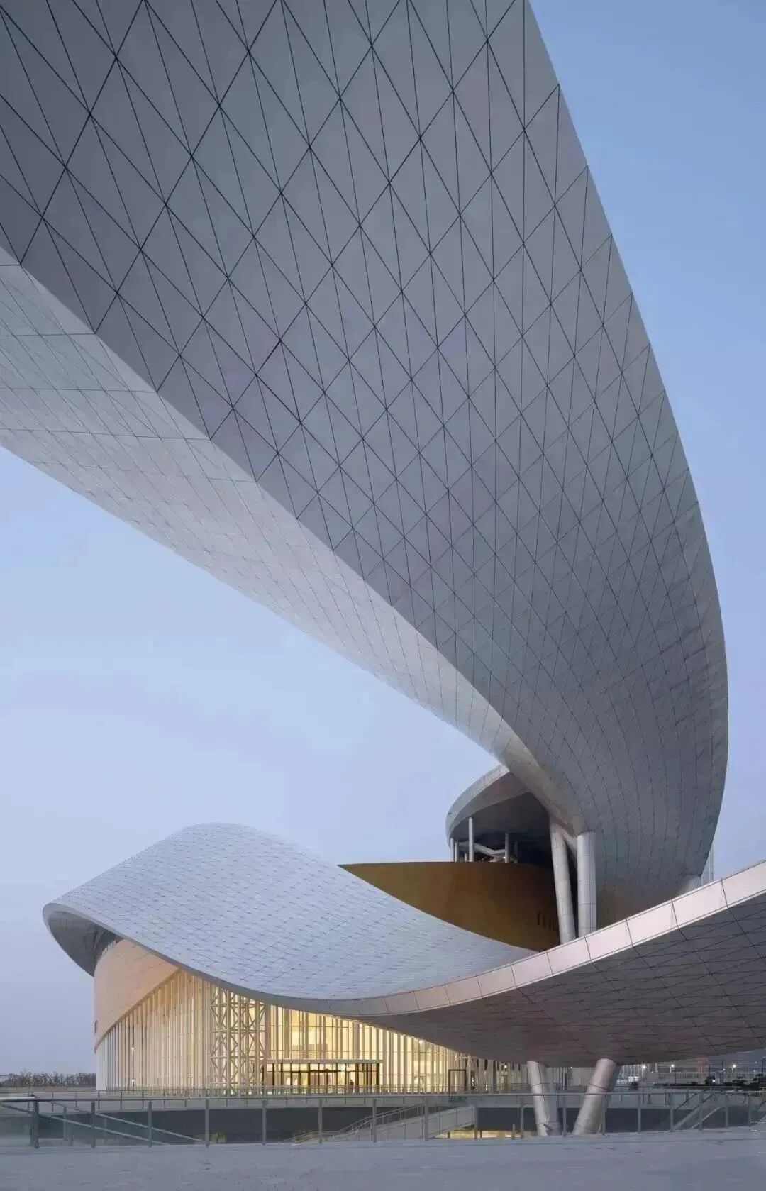 最具特色的是两条闪着银光的金属飘带,“苏州丝绸”与“昆曲水袖”的融合,把江南水乡的柔情演绎得淋漓尽致,灵动曲面与水波相映,阳光在建筑表面流淌,更洒下一股自然和谐的灵性。