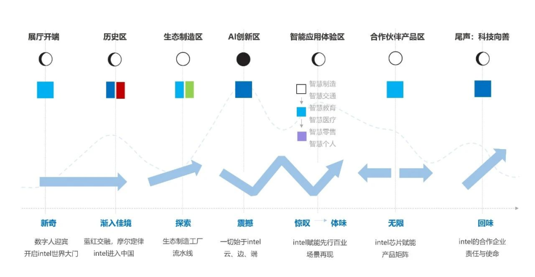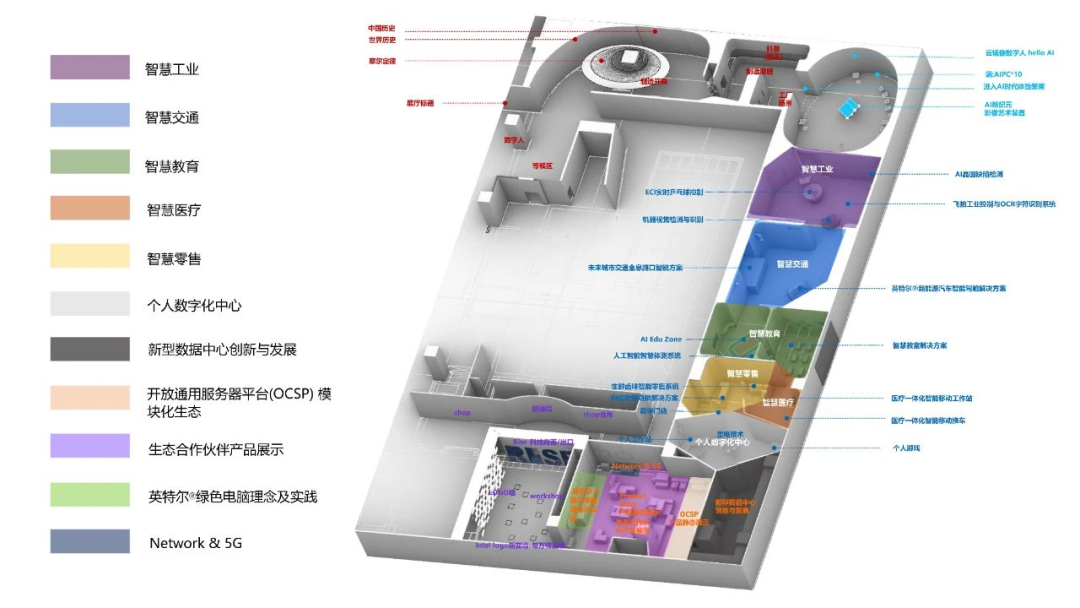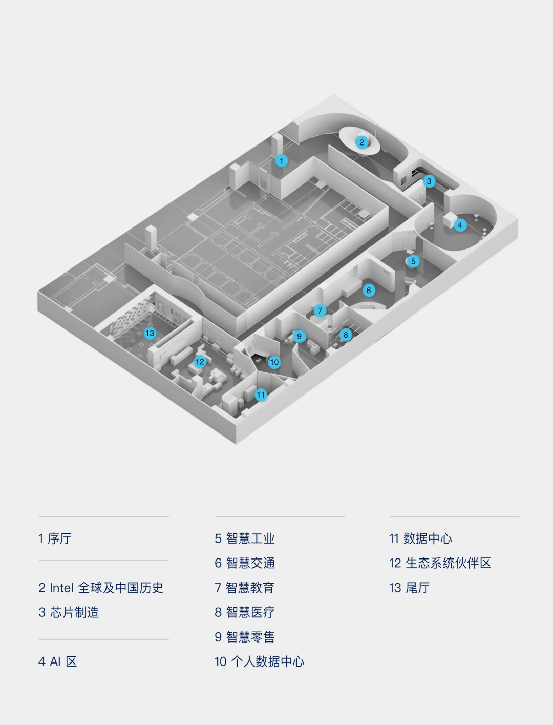 体验中心被划分为十三个展示区域,它们共同描绘了Intel的发展历程及其科技成就。访客可以跟随特别规划的游览路线,逐一探访这些区域,深入感受每个展区的独特吸引力和沉浸式的体验。