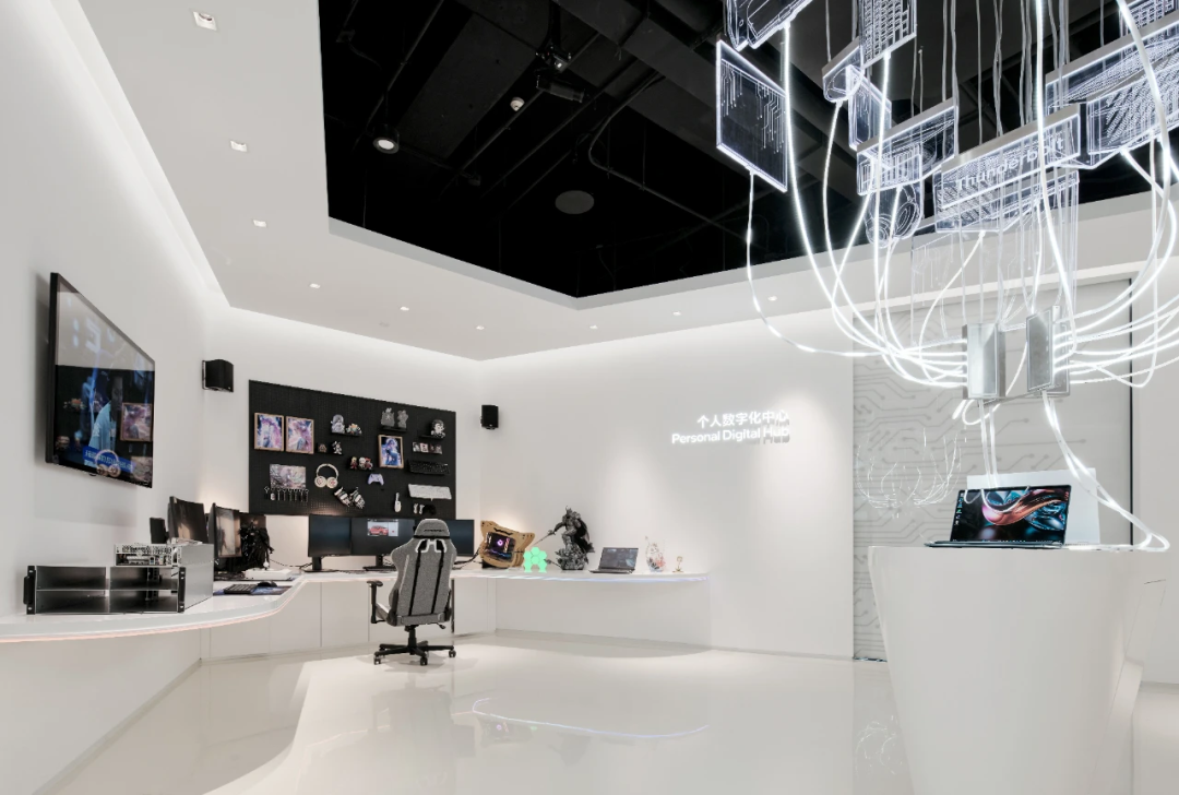 设计采用镜像手法,巧妙对比和区分了个人生活中的游戏场景与工作场景。以多设备串联点亮的“雷电”艺术装置为中心,艺术化地呈现产品多设备连接的高性能,全面展示未来个人数字化创新场景。