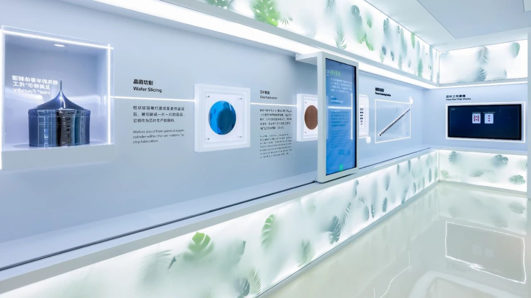 芯片制造区:空间以自然元素为背景来展示芯片的无污染生产,将芯片的生产流程和滑轨屏相结合,让观众了解从沙砾到芯片的详细历程。