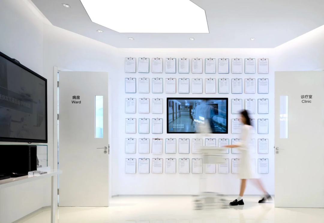 摒弃了常规的实物搭建方式,通过实体门结合病房和诊疗室内部场景图像的方式,既有效满足了客户的医院场景模拟需求,又最大化利用了空间。对于智能医疗车的展示,设计团队抓取典型物品病历本,以重复手法铺满墙面,形成强烈视觉冲击,与智能医疗推车构成鲜明对比,展现科技为医护人员带来的便利。