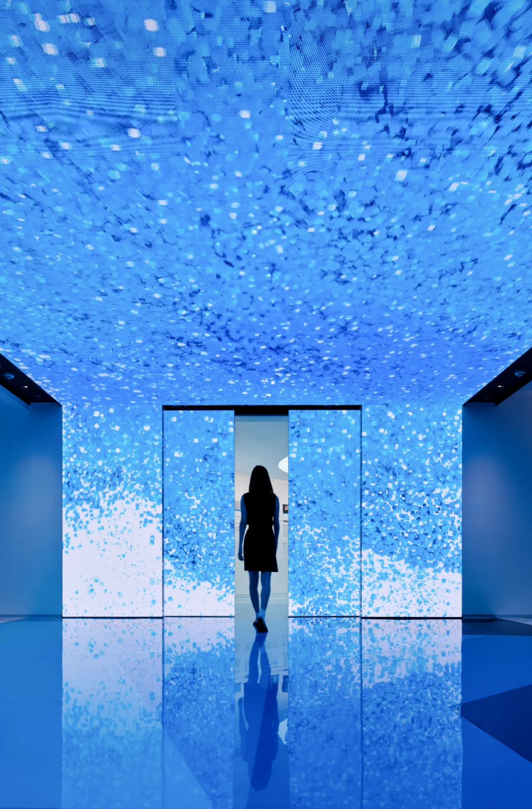 粒子动态影像结合天花和展厅门形成“L”型影像场,这些粒子在流动、牵引、汇聚和衍生,象征品牌引领技术和产品创新的生生不息,引导观众对即将开启的展厅之旅奠定积极的情绪状态。