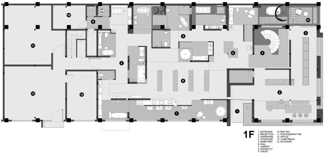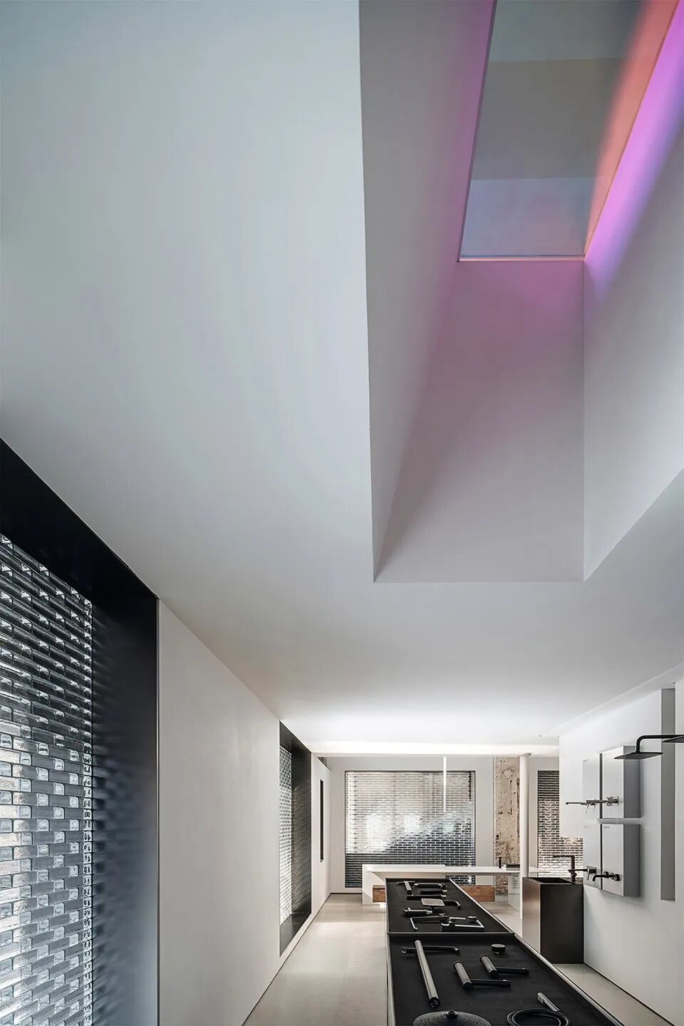 临街面的五金展示区采用玻璃砖墙阻隔车流喧嚣,同时过滤西晒光线。水赋予了洁具存在的意义,透过了玻璃砖的阳光,在室内形成水纹般的光影效果,在此,龙头与光影形成了奇妙的联动。