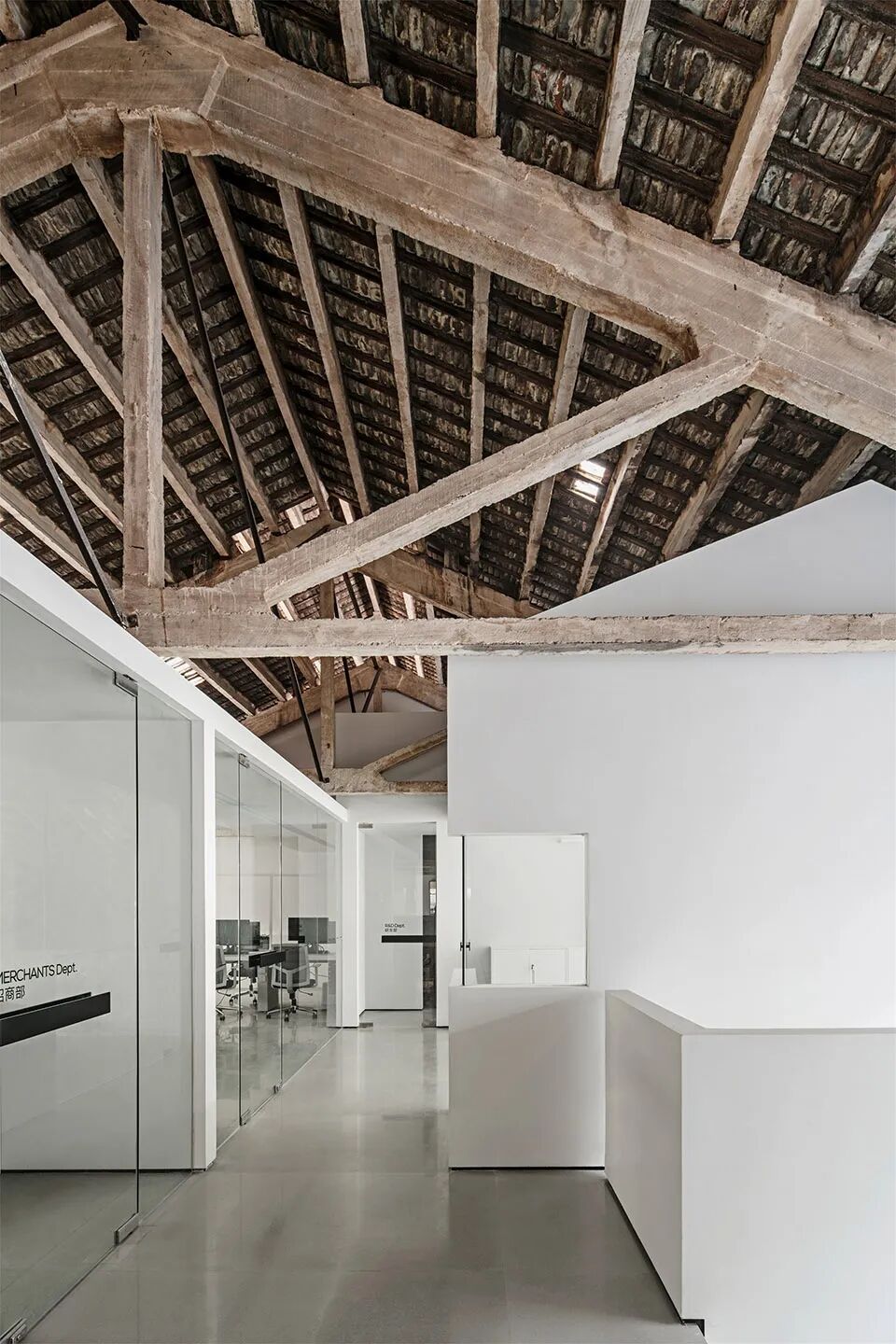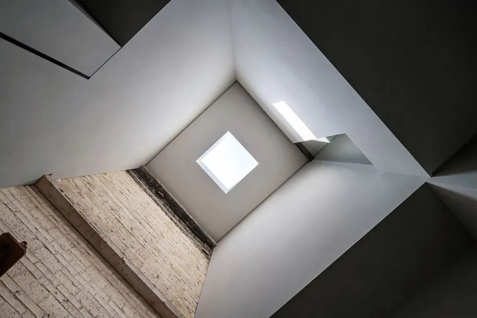 建筑改造之初为解决采光问题而设置的天台及天井,给沉闷的办公空间带来了无限的活力。具有”表现主义”特质的的原始墙面,肌理充满了力量,隐含一种追索意味的历史感,赋予了作品更多的深度和实验性。