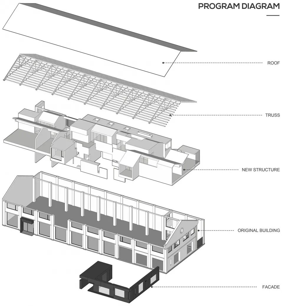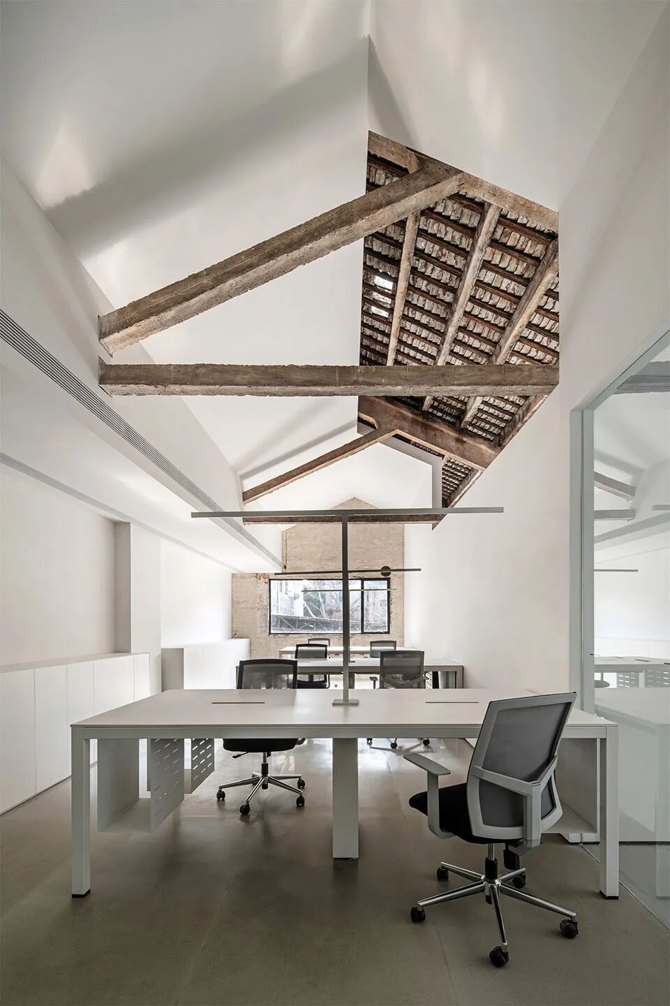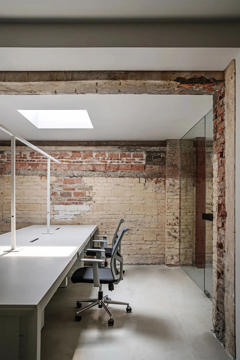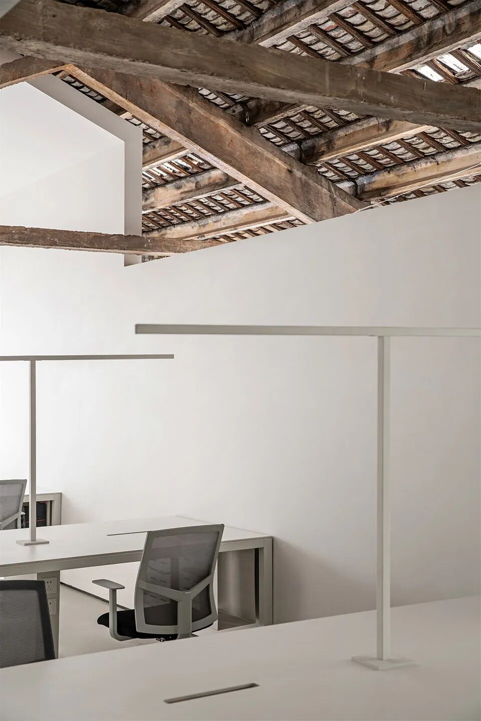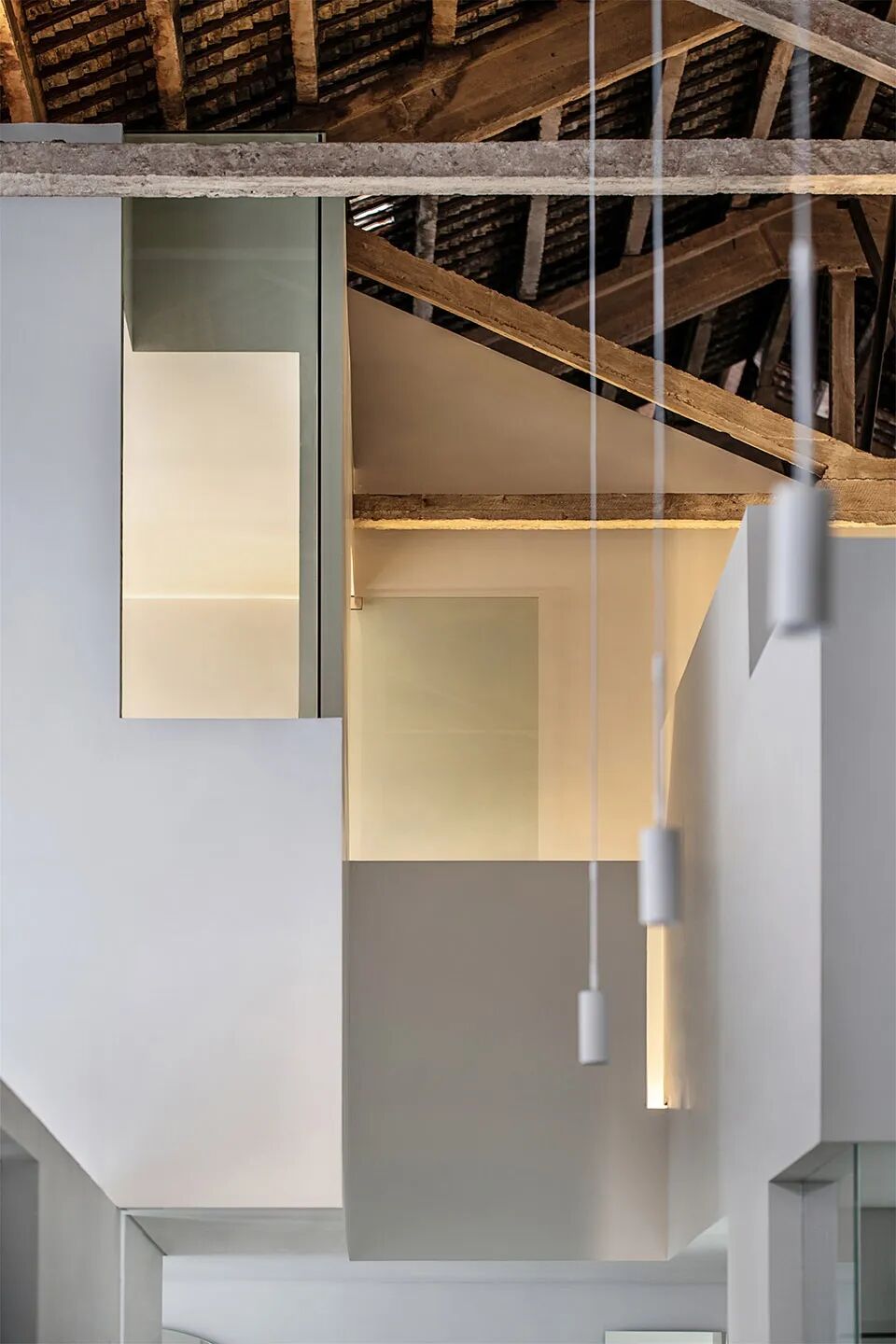 简洁的体块巧妙地穿插在原建筑的架构体系内,现代的材料与破旧的元素形成对比,从而以这种方式表达对原本结构的尊重。