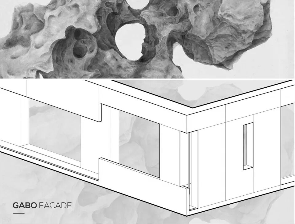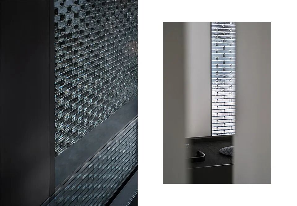 立面以“山石”概念进行现代演绎,黑色几何体块在塑山造石的传统技法下,经过拼、接、错、垂,构筑出一幅有尺度的当代“山石之景”。玻璃砖的运用,延续了建筑的肌理,清晰地预示着过去与当下。巧妙的洞口处理,遵循赏石文化“漏与透”的审美规则,引人入胜。