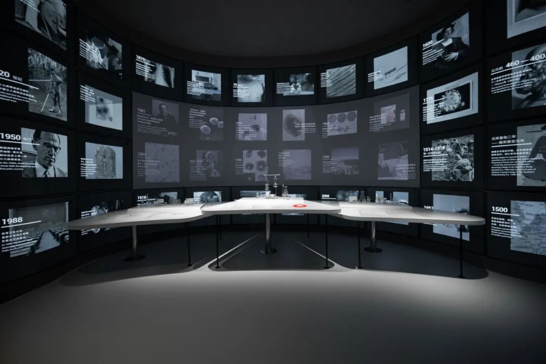 用微观去撬动宏观,是序厅的叙事策略。对于疫苗的研究和疫苗产品的研发是极其微观的事业,但是它引发的是宏观的社会影响,与每个人都息息相关。