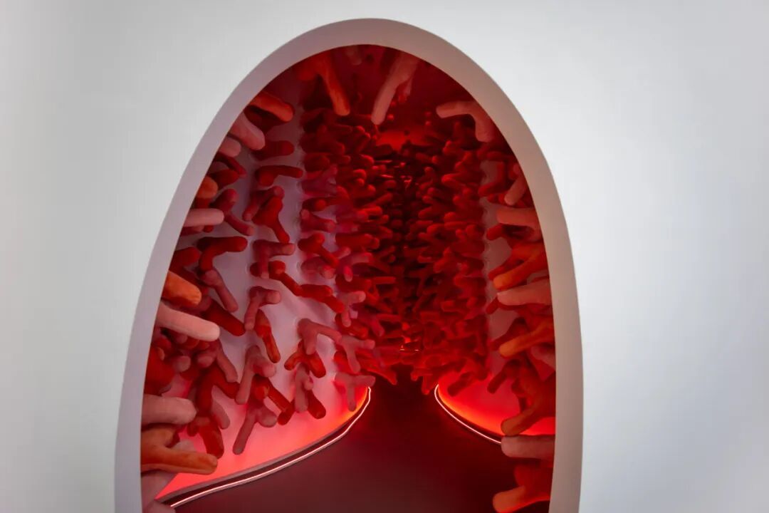 这个隧道是专门为小孩子设计的快速动线。我们从严谨的科学性出发,以“Y字型抗体突触”打造了打卡型的穿梭体验通道。在天花上悬吊了错落的新冠病毒模型,让小孩子在抗体的保护中去到科普区。通过这种有趣的通道体验提起观展的兴趣,作为科普区的铺垫。