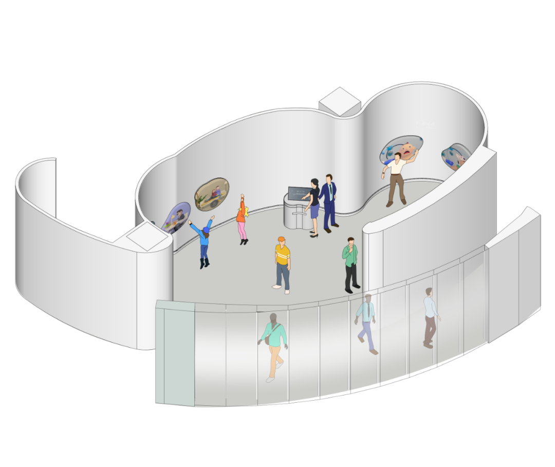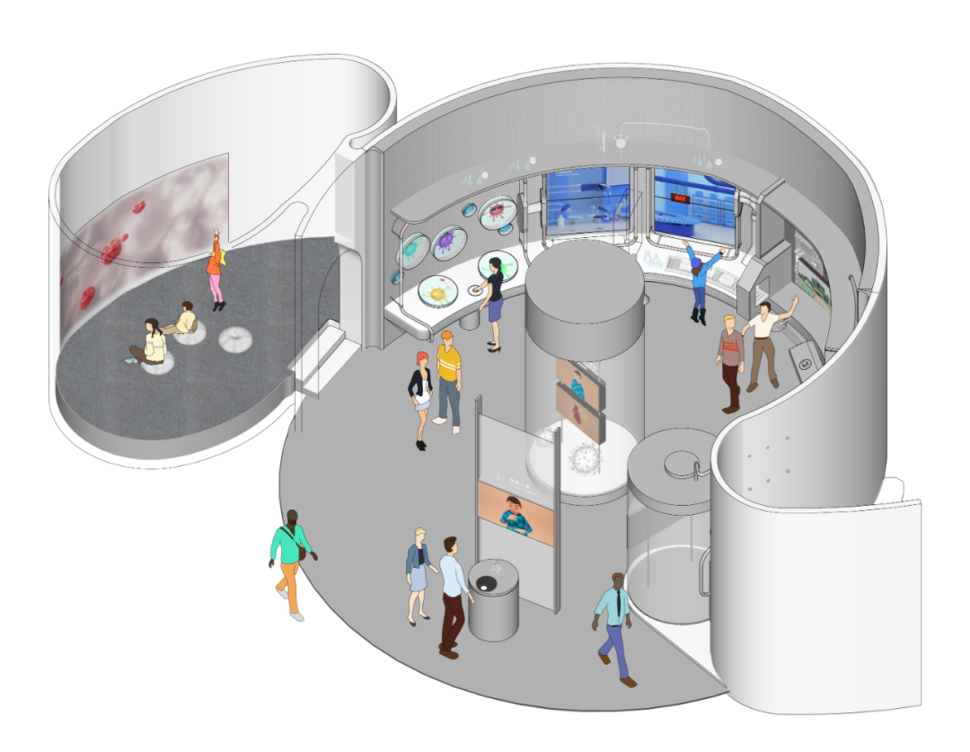 在这个区域,我们的叙事策略是从微观的视角出发,把病毒赋予情感和个性。想象一下:不同的病毒是有自己的性格的,这些微观世界的居民有自己喜欢的人群(老年人、青年人、小孩子),有着各自的特性。观众能够通过这种拟人化赋予情感的卡通形象去认知病毒。当观众了解,就不再恐惧。