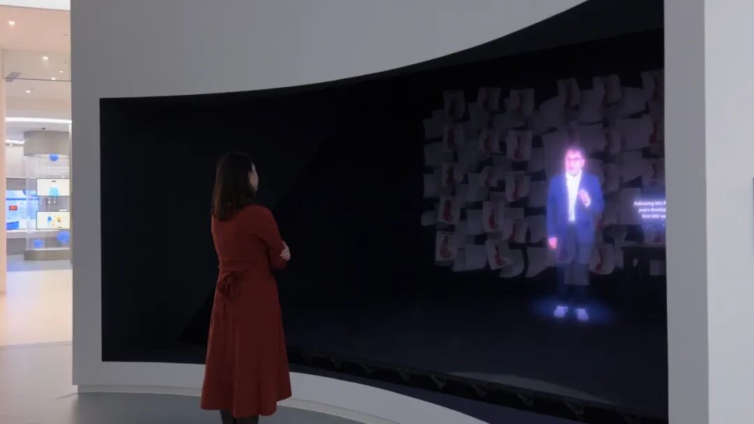 最后是展区的核心装置:“尹卫东说”。以“实体场景”+“立体成像”的方式还原了尹卫东的办公室以及办公室里满墙的疫情形势图。面对观众,尹卫东先生不再是一个头部公司的董事长,而是一个科研者,与普通观众一样面对新冠,用客观中立的态度去述说自己对于疫情的思考。这种平等的对话交流感让观众不仅能看到疫苗产品,更能和产品背后有血有肉的人进行交流,分享观点。