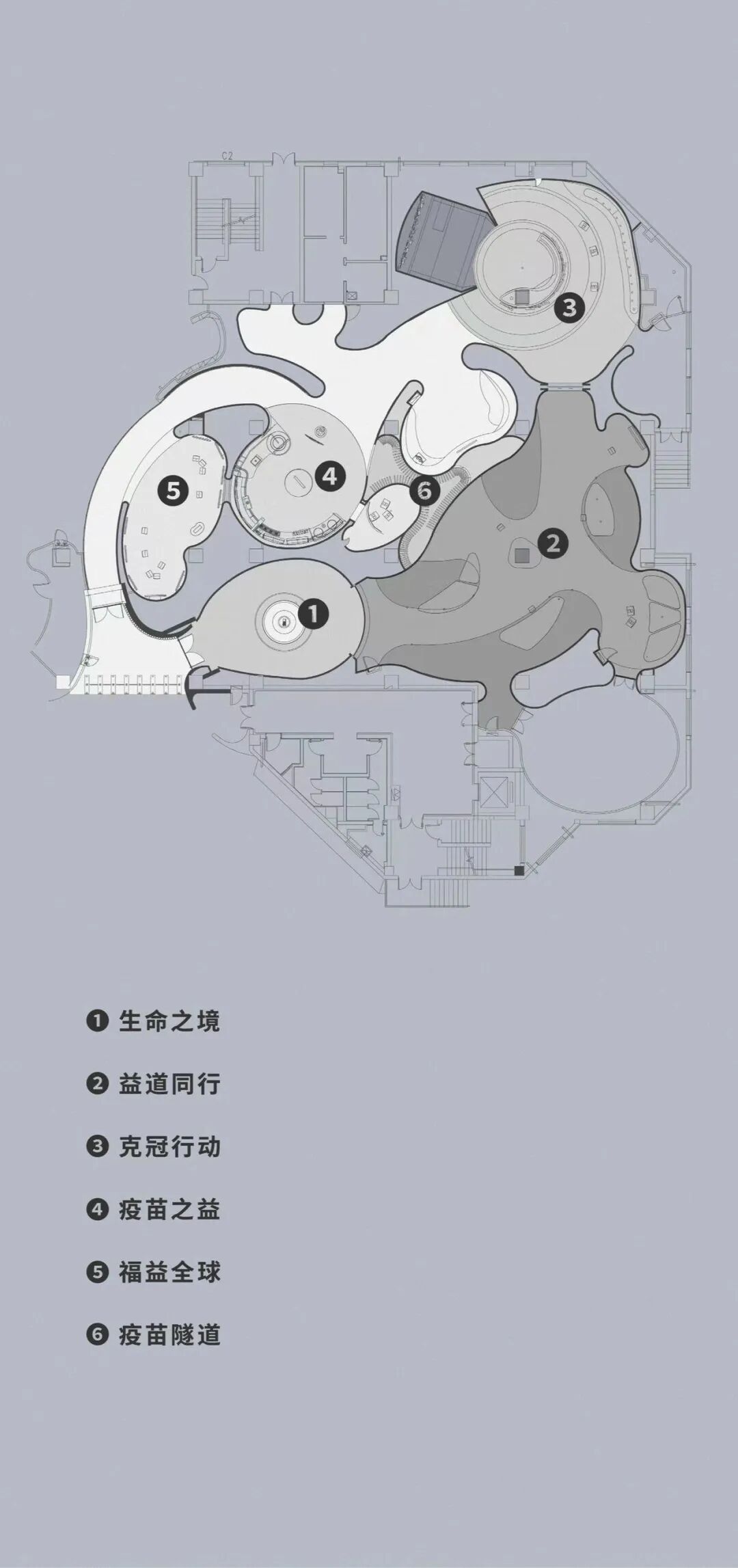 五个剧场分别名为:生命之境,益道同行,克冠行动,疫苗之益,福益全球。每个剧场对应着一个不同维度的情境故事。五个剧场的前后相连,场景从暗到亮,带领观众走进一段跌宕起伏的情绪之旅。
