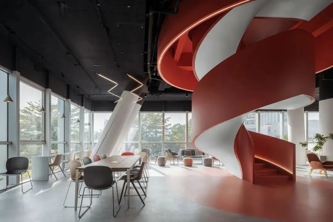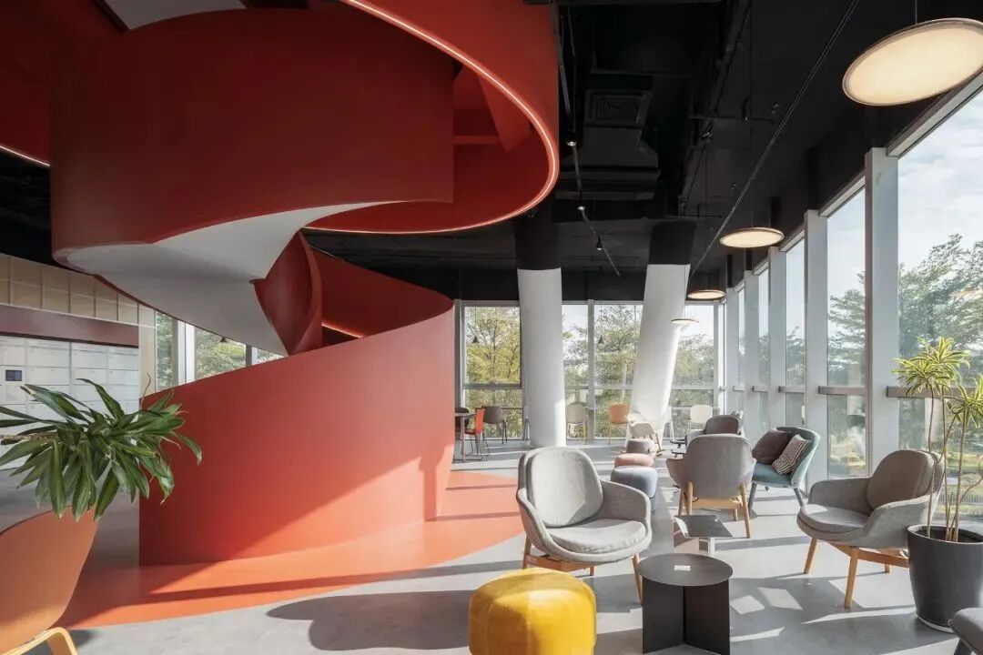 二、三层靠近玻璃幕墙的空间正对着厦门园林博览苑,充足的光线和美好的景色已然非常奢侈,仅增加了功能性吧台、利旧获奖灯具和家具,便轻松打造出舒适的观景咖啡厅及餐厅,并以鲜明的红色螺旋楼梯相连上下二层。