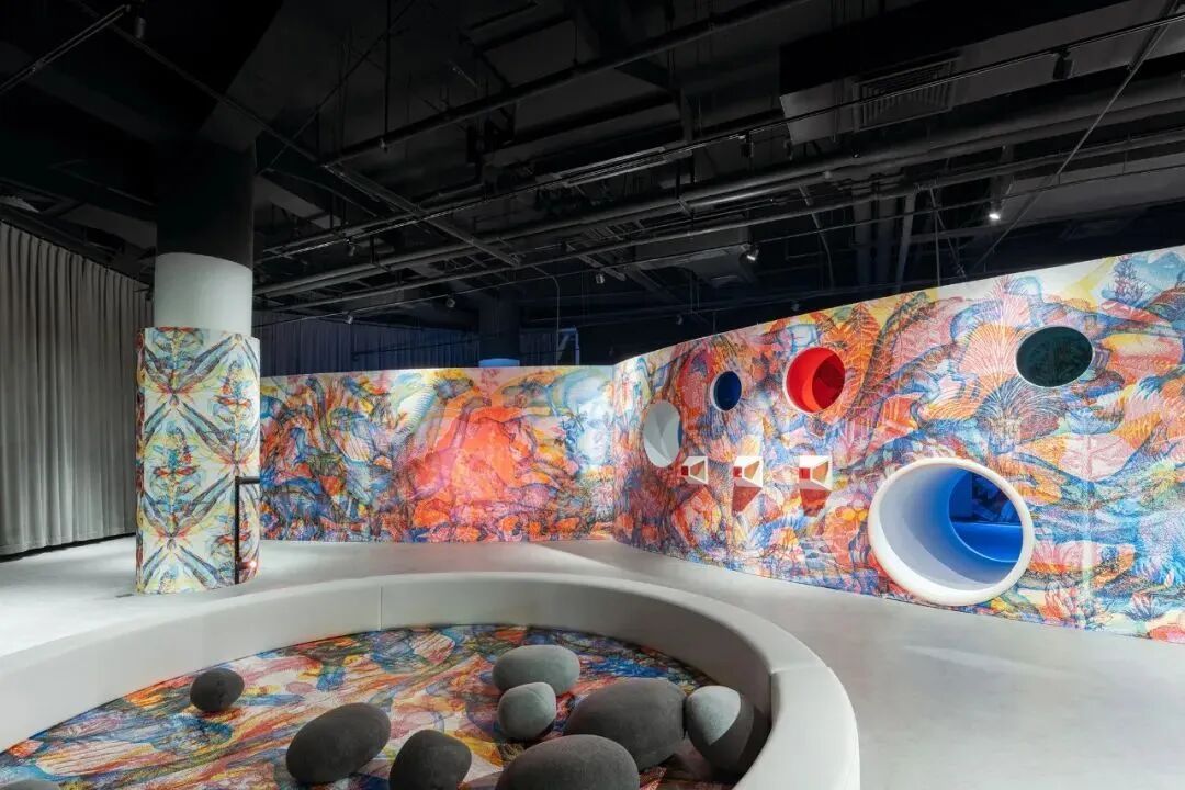 设计团队为儿童展厅设计了开馆展览——幻镜奇迹:RGB光影互动设计展。欧洲艺术家团队基于RGB原理,将红蓝绿三种颜色的插画交叠在一起,通过光色的变化产生绚丽多变的画面。设计了多种观看方式:通过LED灯光让空间在红蓝绿三色中切换,或通过墙面彩色洞口观看等,形成丰富的空间体验。