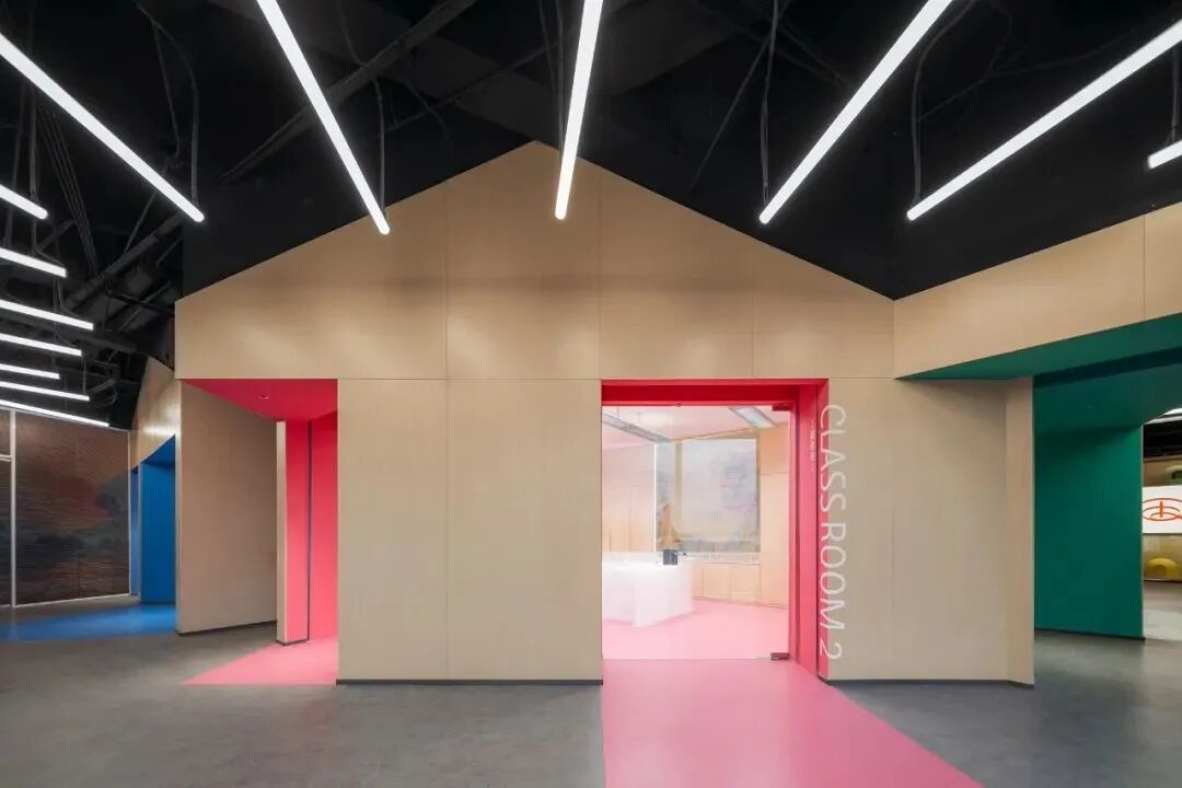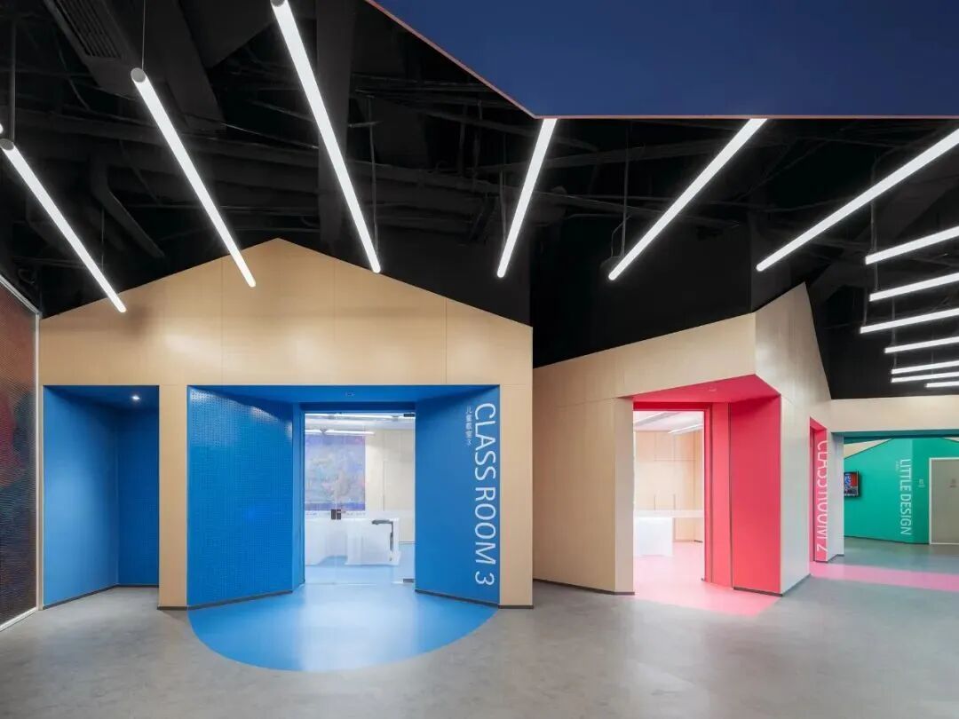 儿童区是相对独立的区域,包含教室及展厅。将儿童教室打造成三个不同主题色的小木屋,通过体块切割产生类似橱窗的界面展示空间,可用来展示小朋友的设计作品。通透的教室空间亦可根据展览需要作为免费迷你展厅。