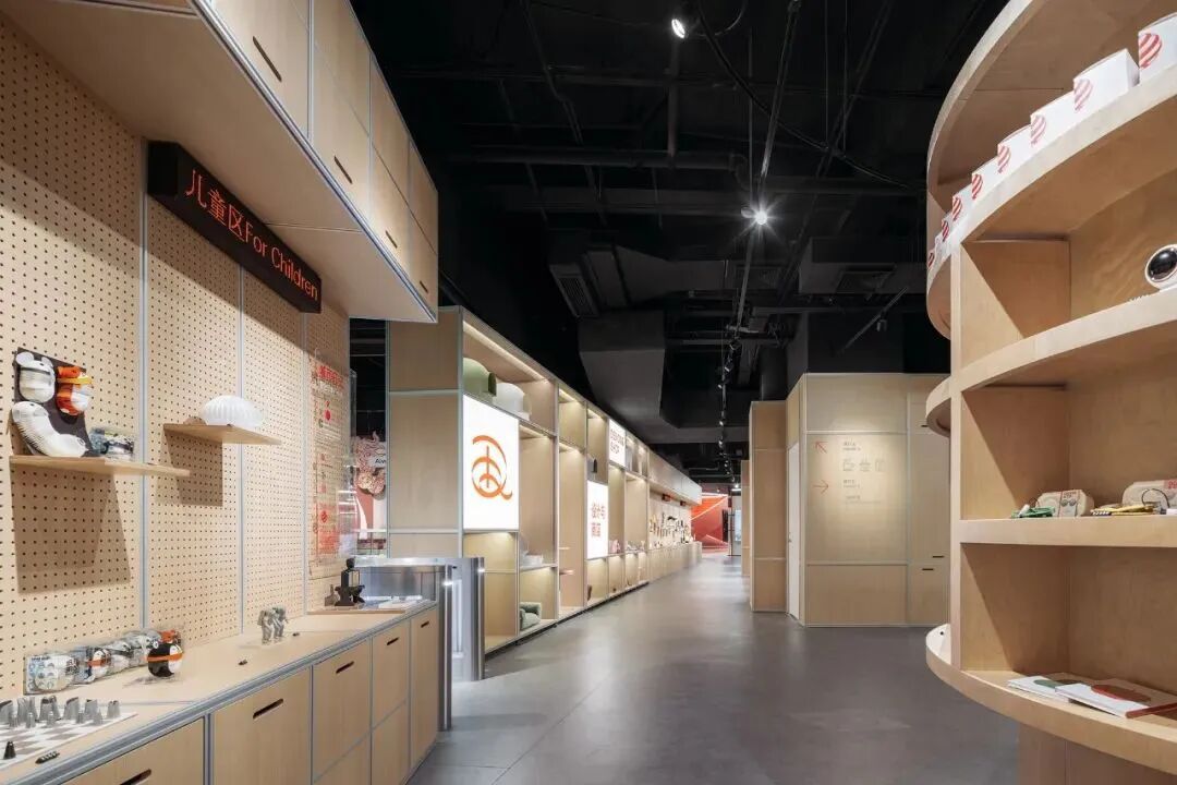 空间分隔界面展览化:在馆内各种过道空间的墙面上布置了大量形态各异的橱窗、洞口、洞洞挂板,赋予过道空间展览属性,使其成为免费展厅,对于参观者是一大福利,也为博物馆带来了商家品牌入驻橱窗的创收业务。
