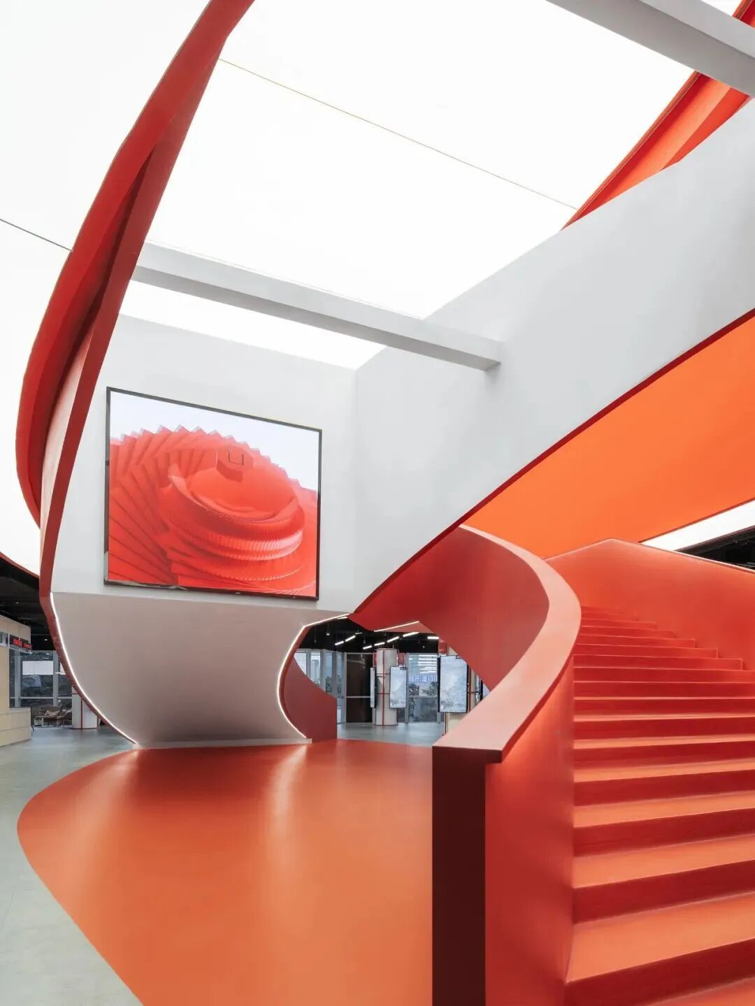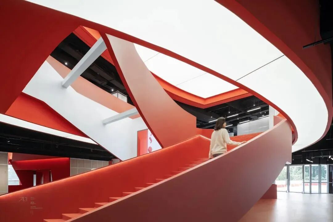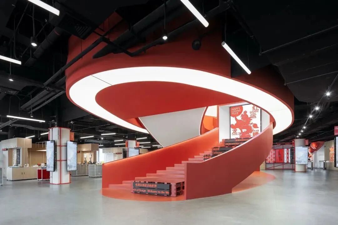 设计团队与跨媒介设计团队协作派对合作,充分挖掘利用现有商业裙楼的空间优势,打造博物馆的重点公共空间,即最具开放性的商业零售区及餐饮咖啡区。通高的中庭空间作为全馆核心正对着博物馆入口,拆除了原电动扶梯,设计了极具标识性的巨型双螺旋红色楼梯取而代之,成为视觉核心。